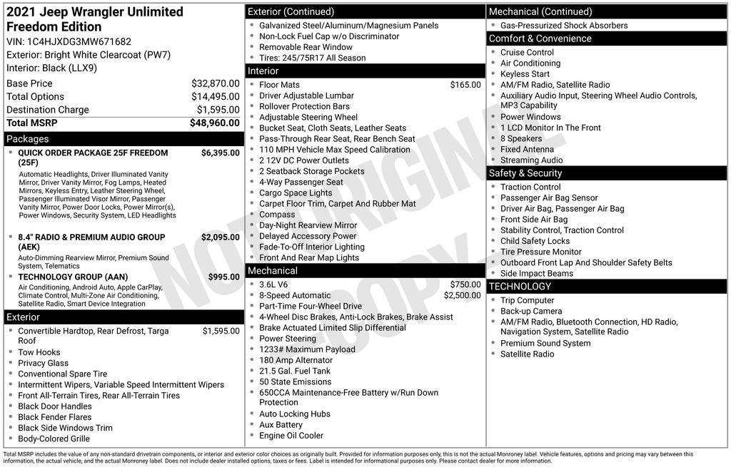 2021 Jeep Wrangler Unlimited Freedom Edition Bright White Clearcoat Unlimited Freedom Edition 4WD 8-Speed Automatic 3.6L V6 24V VVT 3.45 Rear Axle Ratio, 4-Wheel Disc Brakes, 7.0" Touchscreen Display, 8 Speakers, 8.4" Radio & Premium Audio Group, ABS brakes, Air Conditioning, Air Conditioning w/Auto Temperature Control, Air Filtering, Alpine Premium Audio System, AM/FM radio, American Flag Decals, Apple CarPlay, Auto-Dimming Rear-View Mirror, Automatic Headlamps, Aux Battery, Black 3-Piece Hard Top, Black Trail Rated Badge, Brake assist, Cloth Low-Back Bucket Seats, Cluster 7.0" TFT Color Display, Compass, Deep Tint Sunscreen Windows, Delay-off headlights, Driver door bin, Driver vanity mirror, Dual front impact airbags, Dual front side impact airbags, Electronic Stability Control, Emergency/Assistance Call, For More Info, Call 800-643-2112, Freedom Edition Interior Accents, Freedom Edition Package, Freedom Edition Swing Gate Plaque, Freedom Package Decals, Freedom Panel Storage Bag, Front 1-Touch Down Power Windows, Front anti-roll bar, Front Bucket Seats, Front Center Armrest w/Storage, Front fog lights, Front LED Fog Lamps, Front reading lights, Google Android Auto, GPS Antenna Input, Integrated Center Stack Radio, Integrated roll-over protection, Leather Seats w/Cloth Inserts (DISC), Leather Wrapped Steering Wheel, LED Headlamp & Fog Lamp Group, LED Premium Reflector Headlamps, Low tire pressure warning, Matte Black Jeep Badge, MOPAR All-Weather Floor Mats (DISC), No Soft Top, Non-Lock Fuel Cap w/o Discriminator, Normal Duty Suspension, Occupant sensing airbag, Oscar Mike Badge, Outside temperature display, ParkView Rear Back-Up Camera, Passenger door bin, Passenger vanity mirror, Power Heated Mirrors, Power steering, Premium Black Sunrider Soft Top, Quick Order Package 25F Freedom (DISC), Radio data system, Radio: Uconnect 3 w/5" Display, Radio: Uconnect 4 w/7" Display, Radio: Uconnect 4C Nav w/8.4" Display (DISC), Rear anti-roll bar, Rear reading lights, Rear Window Defroster, Rear Window Wiper/Washer, Remote Keyless Entry, Security Alarm, SiriusXM Radio Service, SiriusXM Satellite Radio, Speed control, Speed Sensitive Power Locks, Split folding rear seat, Steel Front Bumper, Steering wheel mounted audio controls, Stop-Start Dual Battery System, Sun Visors w/Illuminated Vanity Mirrors, Tachometer, Technology Group, Telescoping steering wheel, Tilt steering wheel, Traction control, Trip computer, USB Host Flip, Variably intermittent wipers, Wheels: 17" x 7.5" Black Steel Styled, Wheels: 17" x 7.5" Painted Aluminum (DISC), Wrangler Decal.