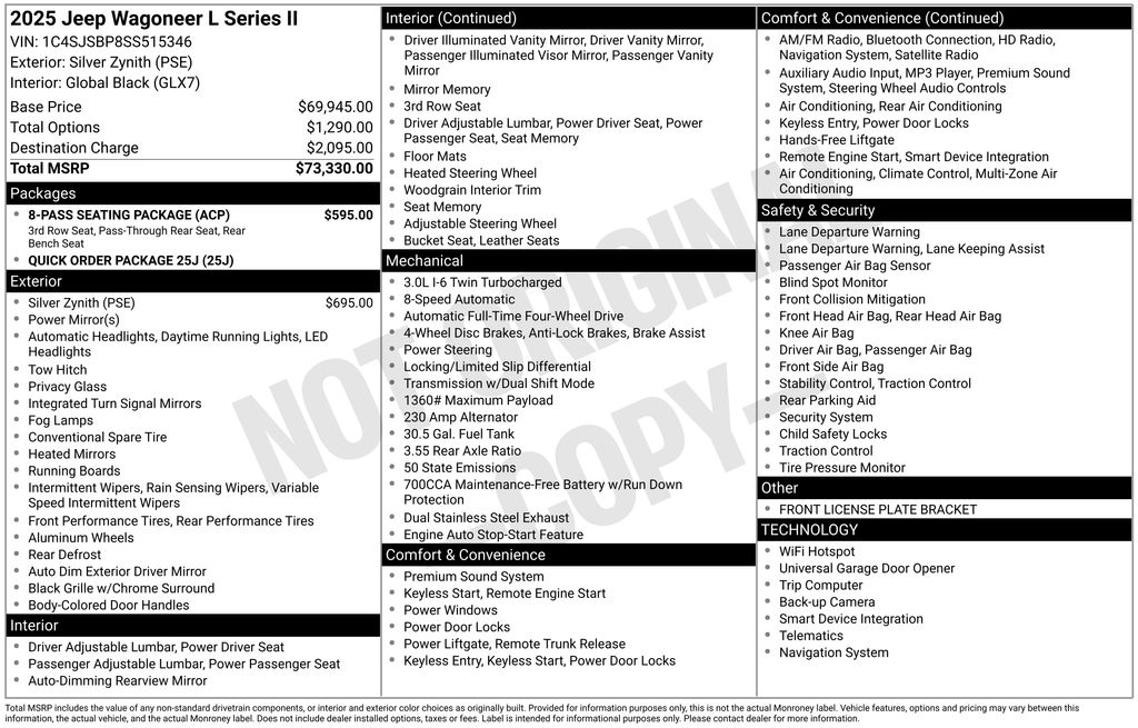 Priced below KBB Fair Purchase Price! 10 Speakers, 118 MPH Maximum Speed Calibration, 3.55 Rear Axle Ratio, 3rd row seats: bench, 4-Wheel Disc Brakes, 40/20/40 2nd Row Bench Power Tip/Slide, 8-Pass Seating Package, 8-Passenger Seating, ABS brakes, Air Conditioning, Alloy wheels, AM/FM radio: SiriusXM with 360L, Anti-whiplash front head restraints, Apple CarPlay/Android Auto, Audio memory, Auto Adjust In Reverse Exterior Mirrors, Auto-dimming door mirrors, Auto-Dimming Exterior Driver Mirror, Auto-dimming Rear-View mirror, Auto-leveling suspension, Automatic temperature control, Brake assist, Bumpers: body-color, Compass, Delay-off headlights, Driver door bin, Driver vanity mirror, Driver's Seat Mounted Armrest, Dual front impact airbags, Dual front side impact airbags, Electronic Stability Control, Emergency communication system: Jeep Connect, Exterior Mirrors Approach Lamps, Exterior Mirrors w/Memory, Exterior Mirrors w/Supplemental Signals, Four wheel independent suspension, Front anti-roll bar, Front Bucket Seats, Front Center Armrest w/Storage, Front dual zone A/C, Front fog lights, Front License Plate Bracket, Front reading lights, Full Length Floor Console, Fully automatic headlights, Garage door transmitter, Genuine wood console insert, Genuine wood dashboard insert, Genuine wood door panel insert, Heated door mirrors, Heated Exterior Mirrors, Heated front seats, Heated rear seats, Heated steering wheel, Illuminated entry, Knee airbag, Leather Trimmed Bucket Seats, Low tire pressure warning, Memory seat, Navigation System, Normal Duty Suspension, Occupant sensing airbag, Outside temperature display, Overhead airbag, Overhead console, Panic alarm, ParkView Rear Back-Up Camera, Passenger door bin, Passenger seat mounted armrest, Passenger vanity mirror, Power adjustable front head restraints, Power door mirrors, Power driver seat, Power Liftgate, Power passenger seat, Power steering, Power windows, Quick Order Package 25J, Radio data system, Radio: Uconnect 5 Nav w/10.1" Display, Rain sensing wipers, Rear air conditioning, Rear anti-roll bar, Rear reading lights, Rear seat center armrest, Rear window defroster, Rear window wiper, Reclining 3rd row seat, Remote keyless entry, Security system, Speed control, Speed-sensing steering, Speed-Sensitive Wipers, Split folding rear seat, Steering wheel memory, Steering wheel mounted audio controls, Tachometer, Telescoping steering wheel, Tilt steering wheel, Traction control, Trip computer, Turn signal indicator mirrors, Variably intermittent wipers, Ventilated front seats, Voltmeter, Wheels: 20" x 9.0" Premium 2 Aluminum.