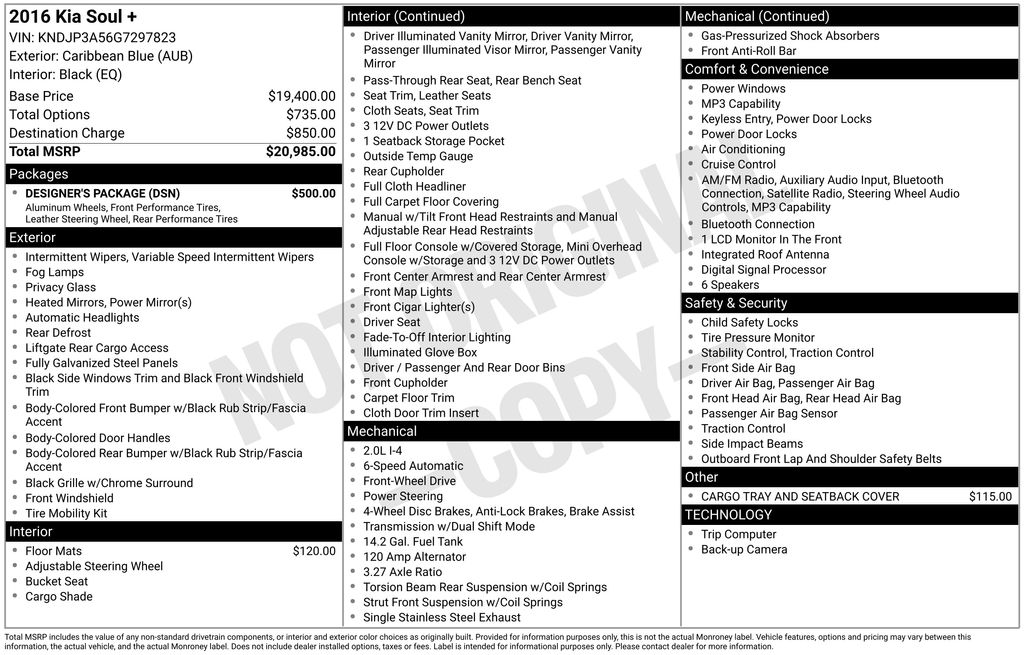 Recent Arrival! 17" x 6.5J Alloy Wheels, 18" Alloy Wheels, 4-Wheel Disc Brakes, 6 Speakers, 6-Way Adjustable Driver's Seat, ABS brakes, Air Conditioning, Alloy wheels, AM/FM radio: SiriusXM, Brake assist, Bumpers: body-color, Cargo Tray and Seatback Cover, Carpeted Floor Mats, Designer's Package, Driver door bin, Driver vanity mirror, Dual front impact airbags, Dual front side impact airbags, Electronic Stability Control, Exterior Parking Camera Rear, Front anti-roll bar, Front Bucket Seats, Front Center Armrest, Front fog lights, Front reading lights, Front wheel independent suspension, Fully automatic headlights, Heated door mirrors, Illuminated entry, Leather-Wrapped Steering Wheel & Gearshift Knob, Low tire pressure warning, Occupant sensing airbag, Outside temperature display, Overhead airbag, Overhead console, Panic alarm, Passenger door bin, Passenger vanity mirror, Power door mirrors, Power steering, Power windows, Radio: AM/FM/MP3 Audio System, Rear seat center armrest, Rear window defroster, Rear window wiper, Remote keyless entry, Speed control, Speed-sensing steering, Split folding rear seat, Steering wheel mounted audio controls, Tachometer, Telescoping steering wheel, Tilt steering wheel, Traction control, Trip computer, Upgraded Cloth Seat Trim, Variably intermittent wipers.