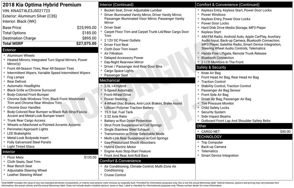 2018 Kia Optima Hybrid Premium Sedan DOHC VVT