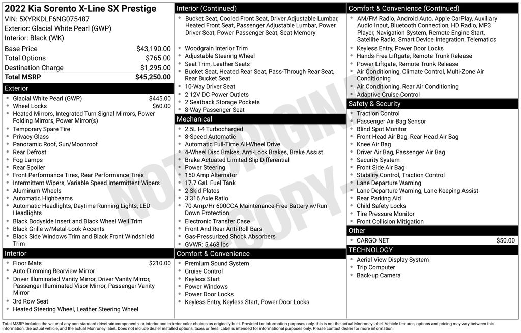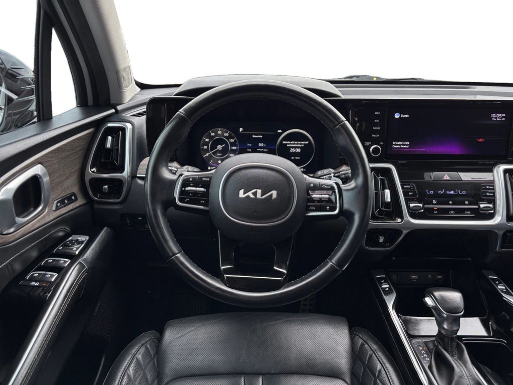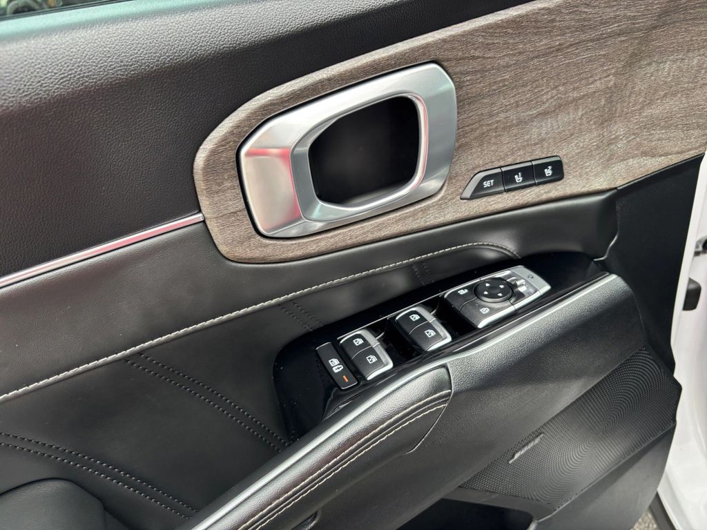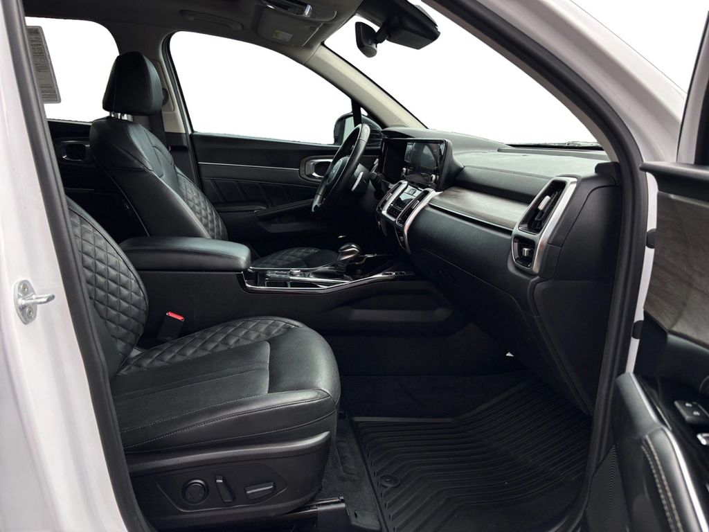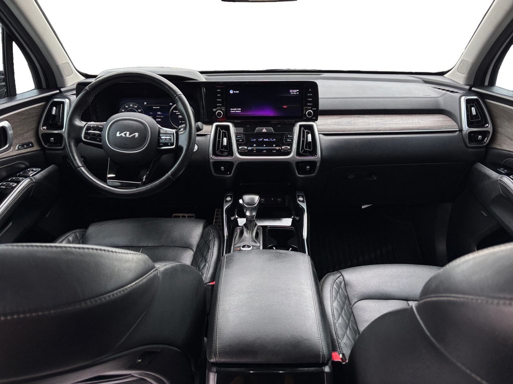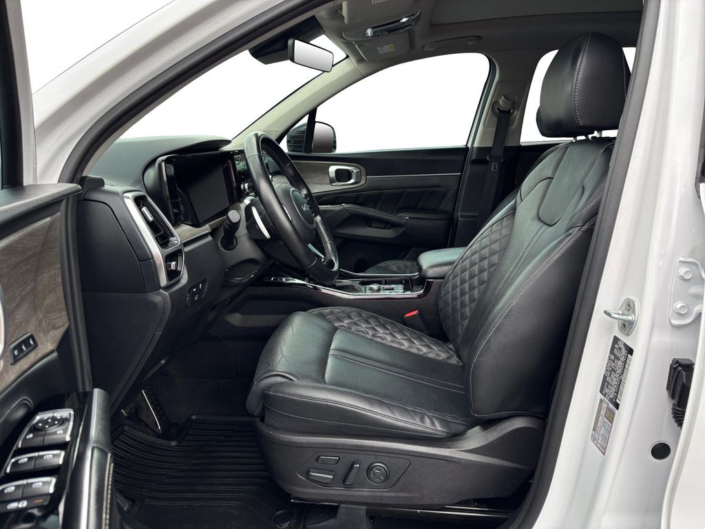 2022 Kia Sorento X-Line SX Prestige Glacial White Pearl X-Line SX Prestige AWD 8-Speed DCT 2.5L I4 DGI Turbocharged DOHC 16V LEV3-ULEV70 281hp AWD, 12 Speakers, 3.316 Axle Ratio, 3rd row seats: split-bench, 4-Wheel Disc Brakes, ABS brakes, Air Conditioning, Alloy wheels, AM/FM radio: SiriusXM, Apple CarPlay & Android Auto, Auto High-beam Headlights, Auto-dimming Rear-View mirror, Automatic temperature control, Brake assist, Bumpers: body-color, Cargo Net, Carpeted Floor Mats, Delay-off headlights, Driver door bin, Driver vanity mirror, Dual front impact airbags, Dual front side impact airbags, Electronic Stability Control, Emergency communication system: UVO Link, Four wheel independent suspension, Front anti-roll bar, Front Bucket Seats, Front Center Armrest, Front dual zone A/C, Front fog lights, Front reading lights, Fully automatic headlights, Heated & Ventilated Front Bucket Seats, Heated door mirrors, Heated front seats, Heated rear seats, Heated steering wheel, Illuminated entry, Knee airbag, Leather steering wheel, Low tire pressure warning, Memory seat, Navigation System, Occupant sensing airbag, Outside temperature display, Overhead airbag, Overhead console, Panic alarm, Passenger door bin, Passenger vanity mirror, Perforated Genuine Leather Seat Trim, Power door mirrors, Power driver seat, Power Liftgate, Power moonroof, Power passenger seat, Power steering, Power windows, Radio data system, Radio: AM/FM Bose Premium Audio System, Rear air conditioning, Rear anti-roll bar, Rear reading lights, Rear window defroster, Rear window wiper, Remote keyless entry, Roof rack: rails only, Security system, Smart Key w/ Push Button and Remote Start, Speed control, Speed-sensing steering, Split folding rear seat, Spoiler, Steering wheel mounted audio controls, Tachometer, Telescoping steering wheel, Tilt steering wheel, Traction control, Trip computer, Turn signal indicator mirrors, Variably intermittent wipers, Ventilated front seats, Wheel Locks, Wheels: 8.5J x 20" Matte Gray Alloy, AWD.