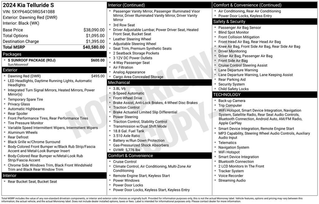 2024 Kia Telluride S **Here at Long-Lewis we believe in being transparent. We have no Doc fees, or any other hidden fees. We are a one price store and give our best price up front and they are clearly marked on all our inventory.** Dawning Red FWD 8-Speed Automatic 3.8L V6 DOHC