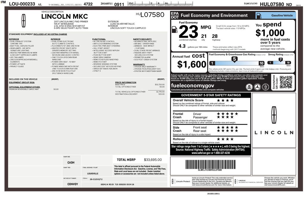 2017 Lincoln MKC Premiere FWD 6-Speed Automatic 2.0L GTDi Silver Metallic
