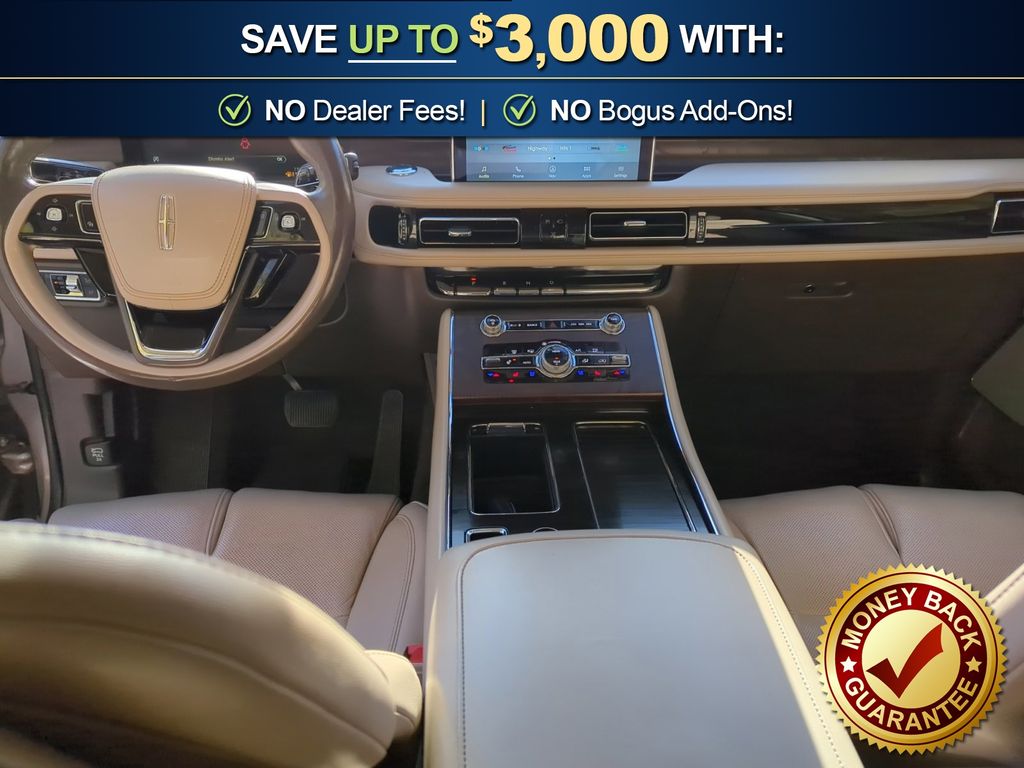 14 Speakers, 2nd Row Bench Seat, 3.58 Axle Ratio, 30-Way Perfect Position Seats w/Active Motion, 3rd row seats: split-bench, 4-Wheel Disc Brakes, ABS brakes, Active Park Assist Plus, Adaptive Cruise Control w/Traffic Jam Assist, Adaptive Pixel LED Headlamps, Air Conditioning, Alloy wheels, AM/FM radio: SiriusXM, Audio memory, Auto Air Refresh, Auto Heated/Ventilated Driver & Passenger Seats, Auto High-beam Headlights, Auto-dimming door mirrors, Auto-dimming Rear-View mirror, Automatic temperature control, Brake assist, Bumpers: body-color, Compass, Convenience Package, Delay-off headlights, Driver door bin, Driver vanity mirror, Dual front impact airbags, Dual front side impact airbags, Electronic Stability Control, Elements Package Plus, Emergency communication system, Equipment Group 201A, Evasive Steering Assist, Four wheel independent suspension, Front anti-roll bar, Front Bucket Seats, Front Center Armrest, Front dual zone A/C, Front fog lights, Front reading lights, Fully automatic headlights, Garage door transmitter, Head-Up Display, Heated door mirrors, Heated front seats, Heated Steering Wheel, Heated VisioBlade Wipers, Heated/Ventilated 2nd Row Outboard Seats, HVAC memory, Illuminated entry, Illumination Package, Knee airbag, Lincoln Co-Pilot360 Plus, Lincoln Lit Star in Grille, Low tire pressure warning, Luxury Package, Memory seat, Navigation System, Occupant sensing airbag, Outside temperature display, Overhead airbag, Overhead console, Panic alarm, Passenger door bin, Passenger vanity mirror, Phone As A Key, Power door mirrors, Power driver seat, Power Liftgate, Power moonroof: Panoramic Vista Roof, Power passenger seat, Power steering, Power windows, Premium Lthr Heated/Ventilated Fnt Captain's Chairs, Radio data system, Radio: Revel AM/FM Audio System w/14 Speakers, Radio: Revel Ultima 3D Audio System w/28 Speakers, Rain sensing wipers, Rear air conditioning, Rear anti-roll bar, Rear audio controls, Rear Door Sunshades, Rear dual zone A/C, Rear reading lights, Rear window defroster, Rear window wiper, Remote keyless entry, Reverse Brake Assist, Security system, SiriusXM, Speed control, Speed-Sensitive Wipers, Split folding rear seat, Spoiler, Steering wheel memory, Steering wheel mounted A/C controls, Steering wheel mounted audio controls, SYNC 3 Communication & Entertainment System, Tachometer, Telescoping steering wheel, Tilt steering wheel, Traction control, Trip computer, Turn signal indicator mirrors, Variably intermittent wipers, Wheels: 20" Bright-Machined Aluminum, Wireless Charging Pad.