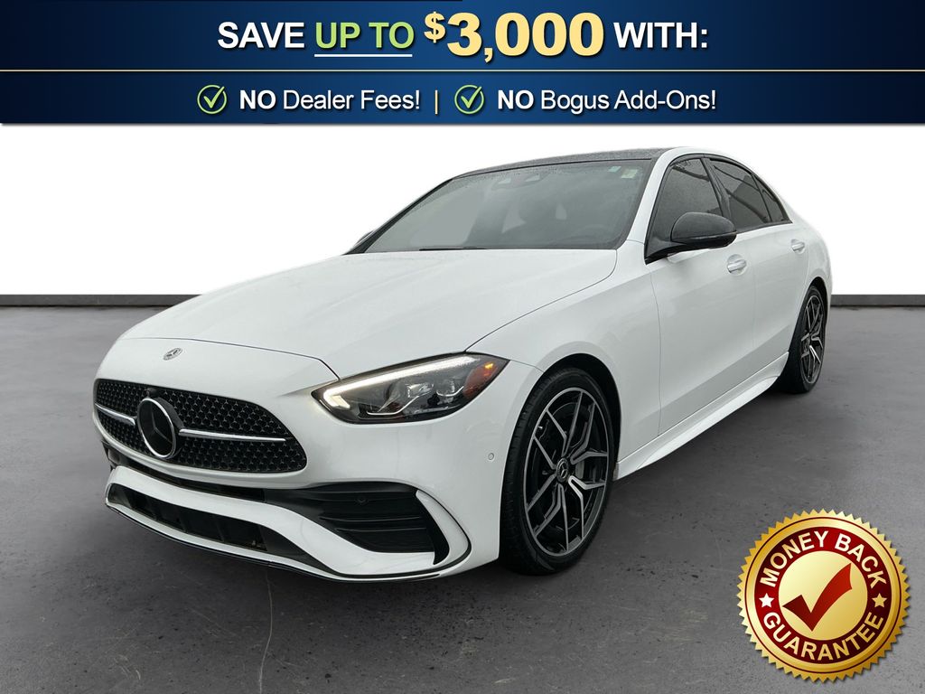 2023 Mercedes-Benz C-Class C 300 White C 300 RWD 9-Speed Automatic 2.0L I4 Turbocharged 11.9" Center Touchscreen Display, 18" 5-Spoke Wheels, 4-way Power Driver's Lumbar Support, 4-Wheel Disc Brakes, 5 Speakers, ABS brakes, Air Conditioning, Alloy wheels, AM/FM radio, Anti-whiplash front head restraints, Apple CarPlay®/Android Auto®, Auto High-beam Headlights, Auto tilt-away steering wheel, Auto-dimming door mirrors, Auto-dimming Rear-View mirror, Automatic temperature control, Brake assist, Bumpers: body-color, Child-Seat-Sensing Airbag, Compass, Delay-off headlights, Driver door bin, Driver vanity mirror, Dual front impact airbags, Dual front side impact airbags, Electronic Stability Control, Emergency communication system: Mercedes-Benz Emergency Call Service, Exterior Parking Camera Rear, Four wheel independent suspension, Front anti-roll bar, Front Bucket Seats, Front Center Armrest, Front dual zone A/C, Front reading lights, Fully automatic headlights, Garage door transmitter: HomeLink, Genuine wood dashboard insert, Head restraints memory, Heated door mirrors, Heated front seats, Illuminated entry, Knee airbag, Low tire pressure warning, MB-Tex Upholstery, Memory seat, Occupant sensing airbag, Outside temperature display, Overhead airbag, Overhead console, Panic alarm, Passenger door bin, Passenger vanity mirror, Power adjustable front head restraints, Power door mirrors, Power driver seat, Power Heated Front Seats w/Memory, Power moonroof, Power passenger seat, Power steering, Power windows, Premium audio system: MBUX, Premium Trim Package, Radio data system, Radio: FrontBass 5-Speaker Audio System, Rain sensing wipers, Rear anti-roll bar, Rear fog lights, Rear reading lights, Rear seat center armrest, Rear window defroster, Remote keyless entry, Security system, Speed control, Speed-sensing steering, Split folding rear seat, Steering wheel memory, Steering wheel mounted audio controls, Tachometer, Telescoping steering wheel, Tilt steering wheel, Traction control, Trip computer, Turn signal indicator mirrors, Variably intermittent wipers, Weather band radio.