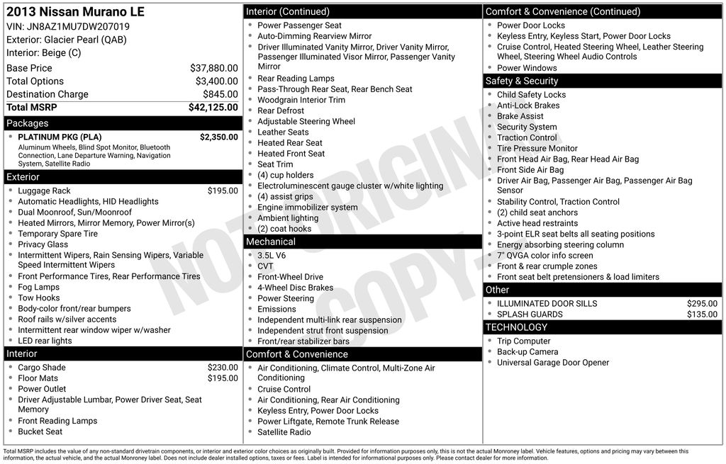 2013 Nissan Murano LE Pearl White Metallic LE FWD CVT with Xtronic 3.5L V6 DOHC CVT with Xtronic, 11 Speakers, 20" Aluminum Alloy Wheels, 4-Wheel Disc Brakes, 5.173 Axle Ratio, ABS brakes, Air Conditioning, Alloy wheels, AM/FM radio: SiriusXM, Anti-whiplash front head restraints, Auto-dimming Rear-View mirror, Automatic temperature control, Brake assist, Bumpers: body-color, CD player, Compass, Delay-off headlights, Driver door bin, Driver vanity mirror, Dual front impact airbags, Dual front side impact airbags, Electronic Stability Control, Exterior Parking Camera Rear, Four wheel independent suspension, Front anti-roll bar, Front Bucket Seats, Front Center Armrest w/Storage, Front dual zone A/C, Front fog lights, Front reading lights, Fully automatic headlights, Garage door transmitter: HomeLink, Heated door mirrors, Heated Front Bucket Seats, Heated front seats, Heated rear seats, Heated steering wheel, High intensity discharge headlights: Bi-Xenon, Illuminated entry, Leather Appointed Seat Trim, Leather Shift Knob, Low tire pressure warning, Memory seat, Occupant sensing airbag, Outside temperature display, Overhead airbag, Overhead console, Panic alarm, Passenger door bin, Passenger vanity mirror, Power door mirrors, Power driver seat, Power Liftgate, Power moonroof, Power passenger seat, Power steering, Power windows, Radio data system, Radio: AM/FM/CD w/Bose Audio System, Rain sensing wipers, Rear anti-roll bar, Rear reading lights, Rear seat center armrest, Rear window defroster, Rear window wiper, Remote keyless entry, Roof rack: rails only, Security system, Speed control, Speed-sensing steering, Speed-Sensitive Wipers, Split folding rear seat, Steering wheel memory, Steering wheel mounted audio controls, Tachometer, Telescoping steering wheel, Tilt steering wheel, Traction control, Trip computer, Variably intermittent wipers, CVT with Xtronic.