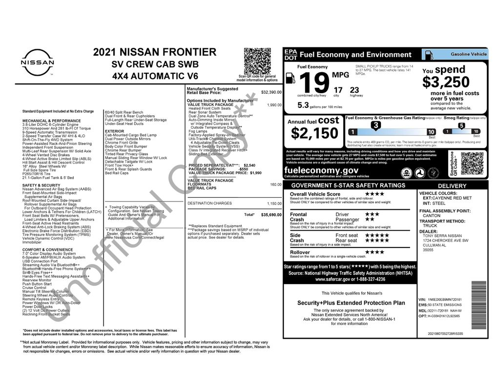 The 2021 Nissan Frontier SV Crew Cab 4WD is a mid-size pickup truck that combines capability and comfort, designed for both work and play. Here's a breakdown of its key features:Fuel Economy: Estimated at around 18 mpg city / 24 mpg highway, depending on driving conditions and load.Drive Type: Four-wheel drive (4WD), which offers enhanced traction and handling, especially in off-road and challenging road conditions.Cab Configuration: Crew cab with 4 doors and seating for up to 5 passengers, providing both comfort and practicality for a variety of uses.