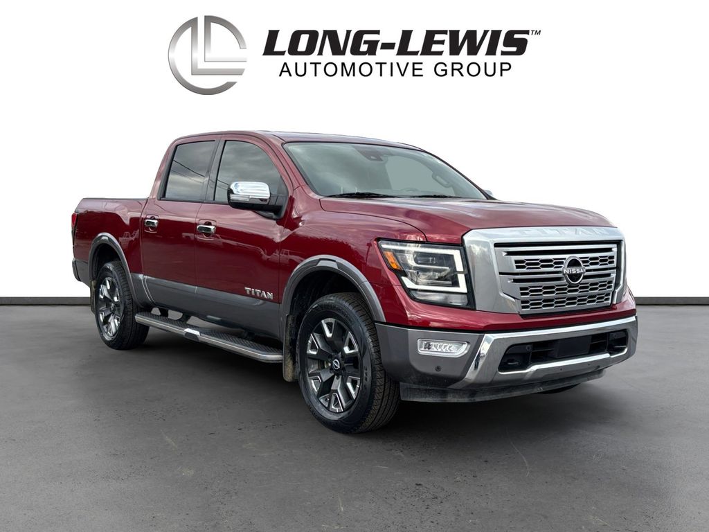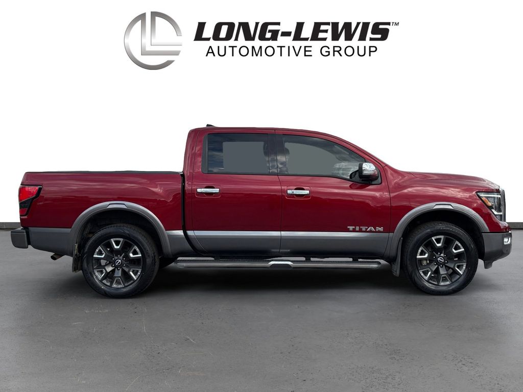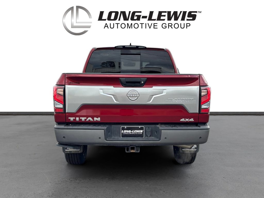 2023 Nissan Titan Platinum Reserve Cardinal Red Metallic Platinum Reserve 4WD 9-Speed Automatic 5.6L V8 DOHC 32V 400hp 4WD, 12 Speakers, 3.69 Axle Ratio, 4-Wheel Disc Brakes, ABS brakes, Air Conditioning, Alloy wheels, AM/FM radio: SiriusXM, Auto High-beam Headlights, Auto tilt-away steering wheel, Auto-dimming door mirrors, Auto-dimming Rear-View mirror, Automatic temperature control, Bed Assist Grip, Blind Spot Warning, Brake assist, Chrome Running Boards, Compass, Delay-off headlights, Door Sill Kick Plates, Driver door bin, Driver vanity mirror, Dual front impact airbags, Dual front side impact airbags, Electronic Stability Control, Emergency communication system: NissanConnect Services, Exterior Parking Camera Rear, Front anti-roll bar, Front Bucket Seats, Front Center Armrest, Front dual zone A/C, Front fog lights, Front reading lights, Front wheel independent suspension, Fully automatic headlights, Garage door transmitter: HomeLink, Genuine wood dashboard insert, Genuine wood door panel insert, Heated & Cooled Front Captain's Seats, Heated door mirrors, Heated front seats, Heated rear seats, Heated steering wheel, Illuminated entry, Knee airbag, Leather Shift Knob, Leather steering wheel, Logo Light, Low tire pressure warning, Memory seat, Moonroof Package, Navigation system: NissanConnect Navigation, NissanConnect Services Powered By SiriusXM, Occupant sensing airbag, Outside temperature display, Overhead airbag, Overhead console, Panic alarm, Passenger door bin, Passenger vanity mirror, Platinum Illuminated Kick Plate, Platinum Reserve Mud Flaps, Platinum Reserve Utility Package, Platinum Utility Package, Power door mirrors, Power driver seat, Power passenger seat, Power steering, Power windows, Premium Leather-Appointed Seat Trim, Radio data system, Radio: NissanConnect w/Navigation, Rain sensing wipers, Rear anti-roll bar, Rear reading lights, Rear seat center armrest, Rear step bumper, Rear window defroster, Remote keyless entry, Security system, Speed control, Speed-sensing steering, Speed-Sensitive Wipers, Split folding rear seat, Steering wheel memory, Steering wheel mounted audio controls, Tachometer, Telescoping steering wheel, Tilt steering wheel, TITAN Box, Traction control, Trip computer, Turn signal indicator mirrors, Variably intermittent wipers, Ventilated front seats, Voltmeter, Wheels: 20" x 8" Dark Painted & Machined Clad, 4WD.