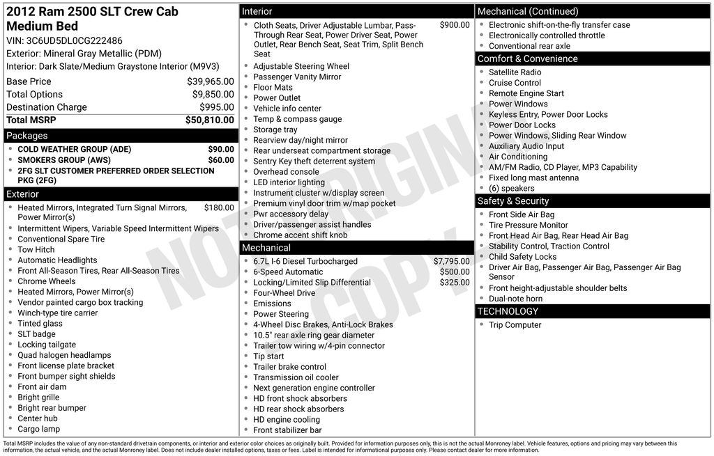 2012 Ram 2500 SLT Mineral Gray Metallic Clearcoat SLT 4WD 6-Speed Automatic Cummins 6.7L I6 Turbodiesel 17" x 8" Steel Chrome Clad Wheels, 3.73 Rear Axle Ratio, 4-Wheel Disc Brakes, 6 Speakers, ABS brakes, Air Conditioning, AM/FM radio: SIRIUS, Anti-Spin Differential Rear Axle, Black Exterior Mirrors, Black Power Trailer Tow Mirrors, Bumpers: chrome, CD player, Center Hub, Cigar Lighter, Cloth 40/20/40 Bench Seat, Cold Weather Group, Compass, Delay-off headlights, Driver door bin, Dual front impact airbags, Dual front side impact airbags, Electronic Stability Control, Engine Block Heater, Exterior Mirrors w/Heating Element, Front anti-roll bar, Front Center Armrest w/Storage, Front reading lights, Fully automatic headlights, Heated door mirrors, Illuminated entry, Locking Tailgate, Low tire pressure warning, Occupant sensing airbag, Outside temperature display, Overhead airbag, Overhead console, Panic alarm, Passenger door bin, Passenger vanity mirror, Power door mirrors, Power steering, Power windows, Quick Order Package 2FG SLT, Radio data system, Radio: Uconnect 130 AM/FM/CD/MP3, Rear seat center armrest, Rear step bumper, Rear Wheel Spats, Remote keyless entry, Removable Ash Tray, Smoker's Group, Speed control, Tachometer, Tilt steering wheel, Traction control, Trip computer, Variably intermittent wipers, Voltmeter, Winter Front Grille Cover.