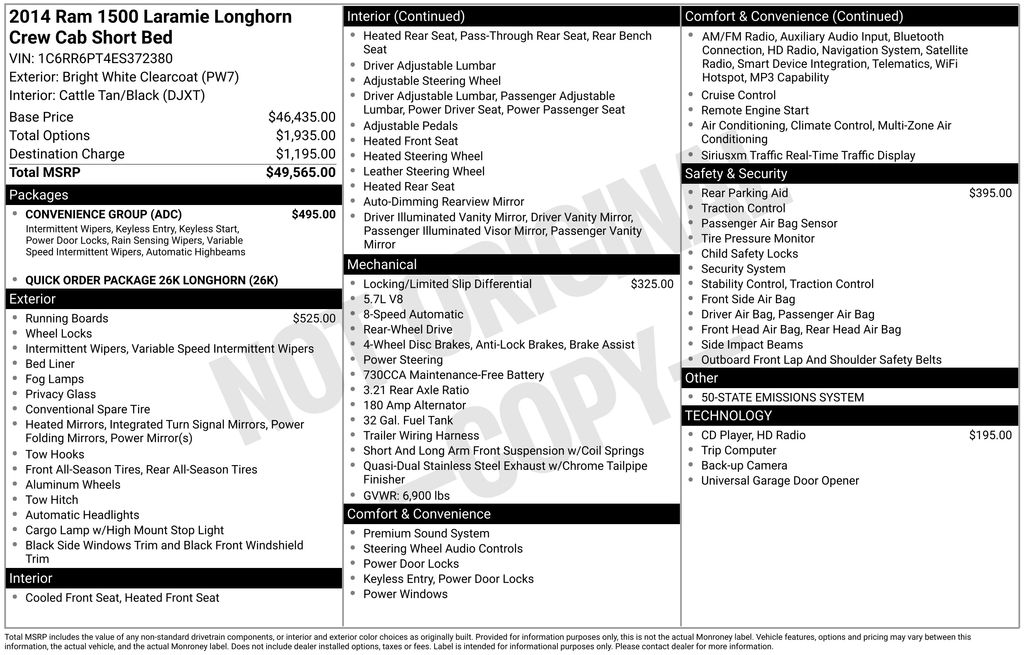 Recent Arrival! 10 Speakers, 115V Auxiliary Power Outlet, 20" x 9" Aluminum Polished/Gold Inserts Wheels, 20" x 9" Polished Aluminum w/Silver Inserts Wheels, 3.21 Rear Axle Ratio, 4-Wheel Disc Brakes, ABS brakes, Adjustable pedals, Air Conditioning, Alloy wheels, AM/FM radio, Anti-Spin Differential Rear Axle, Audio memory, Auto High Beam Headlamp Control, Auto-dimming door mirrors, Auto-dimming Rear-View mirror, Automatic temperature control, Brake assist, Bucket Seats, Center Hub, Chrome Tubular Side Steps, Compass, Convenience Group, Delay-off headlights, Driver door bin, Driver vanity mirror, Dual front impact airbags, Dual front side impact airbags, Electronic Stability Control, Emergency communication system, Folding Flat Load Floor Storage, Front anti-roll bar, Front Bucket Seats, Front Center Armrest w/Storage, Front dual zone A/C, Front fog lights, Front reading lights, Front wheel independent suspension, Fully automatic headlights, Garage door transmitter, Genuine wood dashboard insert, Genuine wood door panel insert, Heated door mirrors, Heated Front Seats, Heated front seats, Heated rear seats, Heated Second Row Seats, Heated Steering Wheel, Heated steering wheel, High Back Seats, Illuminated entry, Keyless Enter-N-Go, Leather Shift Knob, Leather steering wheel, Low tire pressure warning, Memory seat, Navigation System, Occupant sensing airbag, Outside temperature display, Overhead airbag, Overhead console, Panic alarm, ParkSense Front/Rear Park Assist System (DISC), ParkView Rear Back-Up Camera, Passenger door bin, Passenger vanity mirror, Pedal memory, Power 10-Way Memory Driver & 6-Way Passenger Seats, Power door mirrors, Power driver seat, Power Lumbar Adjust, Power passenger seat, Power steering, Power windows, Premium Filigree Leather Seats, Quick Order Package 26K Longhorn, Radio data system, Radio: Uconnect 8.4AN AM/FM/SXM/HD/BT/NAV, Rain Sensitive Windshield Wipers, Rear 60/40 Split Folding Seat, Rear anti-roll bar, Rear seat center armrest, Rear step bumper, Remote keyless entry, Remote Proximity Keyless Entry, Security system, Single Disc Remote CD Player, Speed control, Split folding rear seat, Steering Wheel Mounted Audio Controls, Steering wheel mounted audio controls, Tachometer, Tilt steering wheel, Traction control, Trip computer, Turn signal indicator mirrors, Variably intermittent wipers, Ventilated Front Seats, Ventilated front seats, Voltmeter.