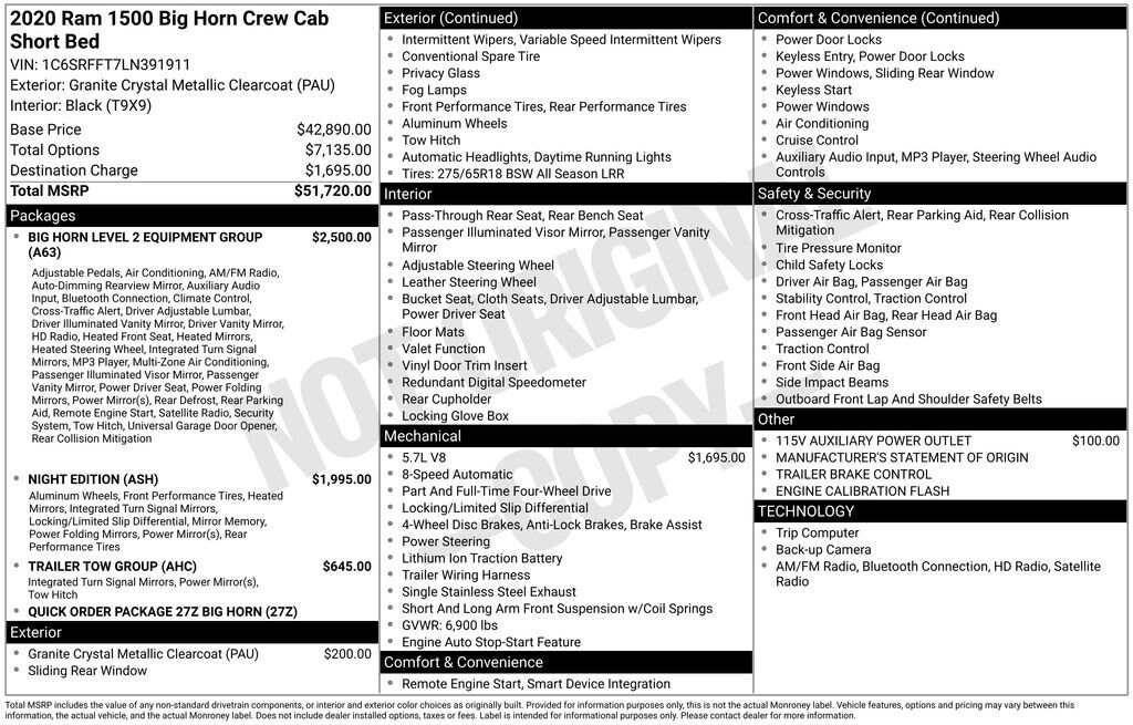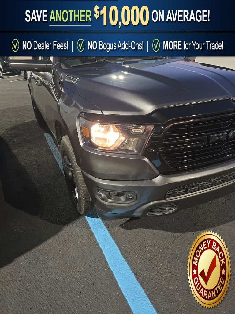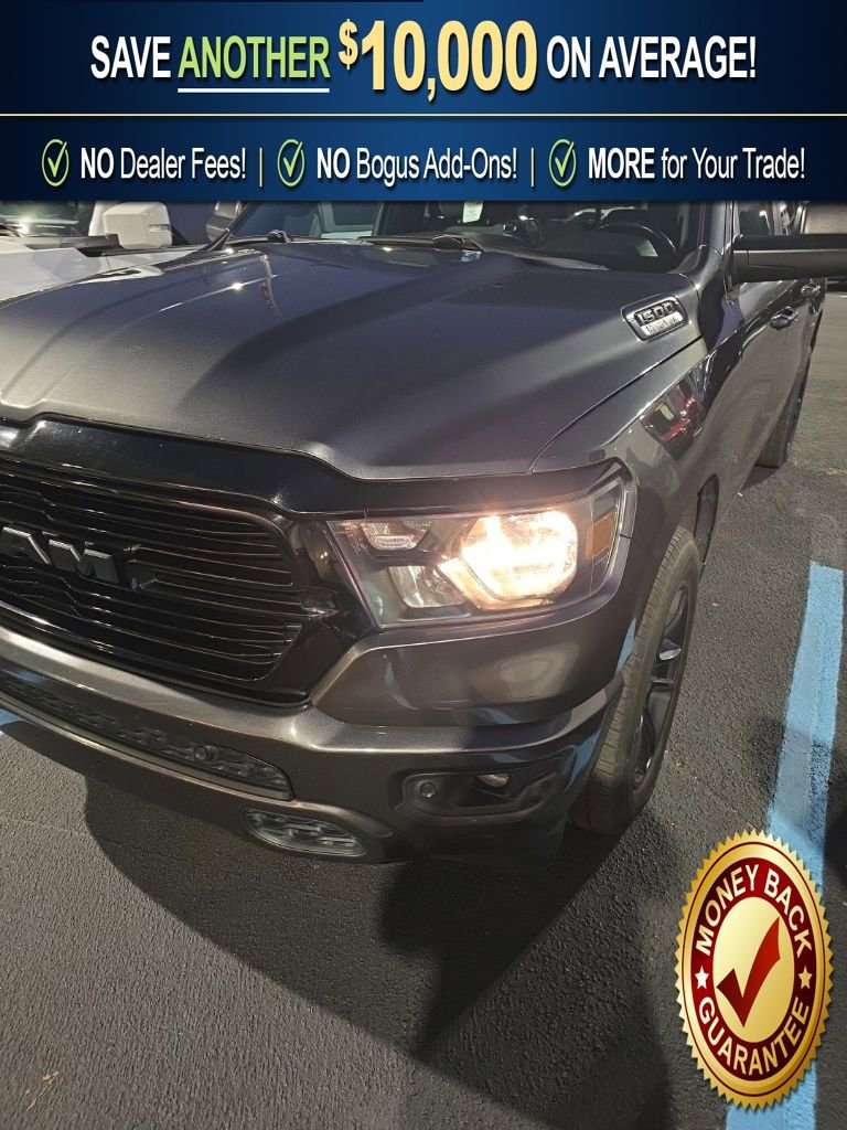 Recent Arrival! 115V Auxiliary Power Outlet, 115V Auxiliary Rear Power Outlet, 2 USB Full Function/Charge Only Media Hub, 2nd Row In Floor Storage Bins, 3 Rear Seat Head Restraints, 3.21 Rear Axle Ratio, 4 Way Front Headrests, 4-Wheel Disc Brakes, 400W Inverter, 48V Belt Starter Generator, 6 Speakers, ABS brakes, Add Class IV Receiver Hitch, Air Conditioning, Air Conditioning ATC w/Dual Zone Control, Alloy wheels, AM/FM radio, Anti-Spin Differential Rear Axle, Auto-Dimming Exterior Driver Mirror, Auto-Dimming Rear-View Mirror, Big Horn Badge, Big Horn IP Badge, Big Horn Level 2 Equipment Group, Black Exterior Truck Badging, Black Headlamp Bezels, Black Interior Accents, Black Premium Power Mirrors, Black Trailer Tow Power Mirrors, Body Color Door Handles, Body Color Exterior Mirrors, Body Color Front Bumper, Body Color Premium Power Mirrors, Body Color Rear Bumper w/Step Pads, Brake assist, Bucket Seats, Bumpers: chrome, Class IV Receiver Hitch, Cloth Bench Seat, Compass, Dampened Tailgate, Delay-off headlights, Deluxe Cloth Bucket Seats, Driver door bin, Dual Exhaust w/Black Tips, Dual front impact airbags, Dual front side impact airbags, Electronic Stability Control, Engine Calibration Flash (DISC), Exterior Mirrors Courtesy Lamps, Exterior Mirrors w/Memory, Foam Bottle Insert (Door Trim Panel), Front anti-roll bar, Front Center Armrest w/Storage, Front fog lights, Front reading lights, Front Seat Back Map Pockets, Front wheel independent suspension, Full Length Floor Console, Fully automatic headlights, Glove Box Lamp, GPS Antenna Input, Grille Surround 1 Black Texture 2 Black, Heated door mirrors, Heated Front Seats, Heated Steering Wheel, Illuminated entry, Leather steering wheel, Low tire pressure warning, Manual Adjust 4-Way Front Passenger Seat, Manufacturer's Statement of Origin, Night Edition, Occupant sensing airbag, Outside temperature display, Overhead airbag, Overhead console, Panic alarm, ParkSense Front/Rear Park Assist w/Stop, ParkView Rear Back-Up Camera, Passenger door bin, Passenger vanity mirror, Power 4-Way Driver Lumbar Adjust, Power 8-Way Driver Seat, Power Adjustable Pedals, Power door mirrors, Power steering, Power windows, Power-Folding Mirrors, Quick Order Package 27Z Big Horn, Radio data system, Radio: Uconnect 3 w/5 Display, Radio: Uconnect 4 w/8.4 Display, Rear 60/40 Folding Seat, Rear anti-roll bar, Rear Dome w/On/Off Switch Lamp, Rear Power Sliding Window, Rear seat center armrest, Rear step bumper, Rear Window Defroster, Remote keyless entry, Remote Start System, Security Alarm, SiriusXM Satellite Radio, Speed control, Split folding rear seat, Steering wheel mounted audio controls, Sun Visors w/Illuminated Vanity Mirrors, Tachometer, Telescoping steering wheel, Tilt steering wheel, Traction control, Trailer Brake Control, Trailer Tow Group, Trip computer, Universal Garage Door Opener, Variably intermittent wipers, Voltmeter, Wheels: 18 x 8 Cast-Aluminum Painted, Wheels: 20 x 9.0 Premium Paint/Polished.2020 Ram 1500 Big Horn/Lone Star 4WD 8-Speed Automatic HEMI 5.7L V8 Multi Displacement VVT Granite Crystal Metallic ClearcoatOdometer is 2982 miles below market average!
