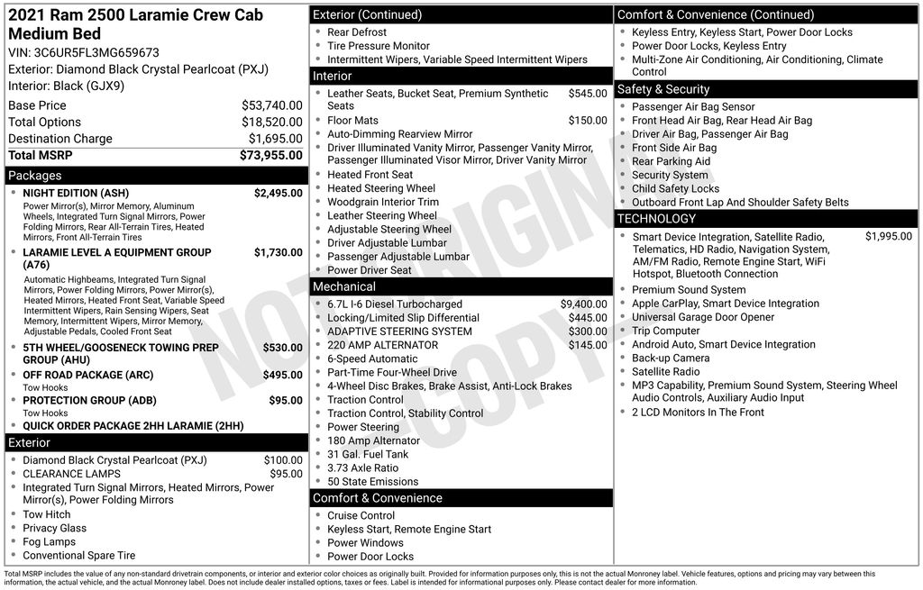 2021 Ram 2500 Laramie **Here at Long-Lewis we believe in being transparent. We have no Doc fees, or any other hidden fees. We are a one price store and give our best price up front and they are clearly marked on all our inventory.** Diamond Black Crystal Pearlcoat 4WD 6-Speed Automatic Cummins 6.7L I6 Turbodiesel