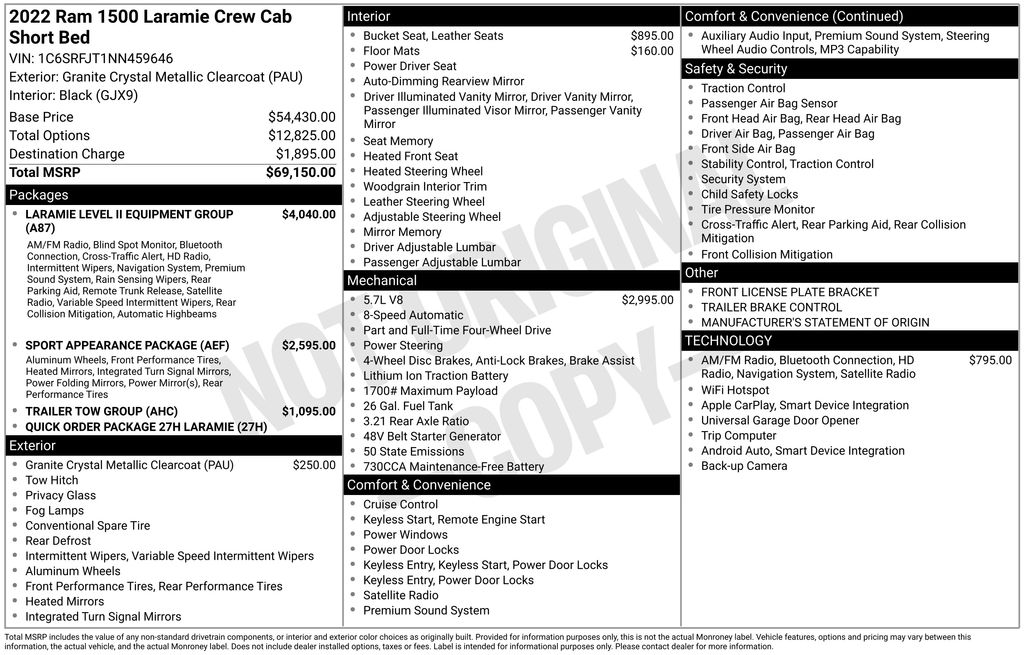 Recent Arrival! #1 Seat Foam Cushion, 10 Speakers, 2nd Row In Floor Storage Bins, 3 Rear Seat Head Restraints, 3.21 Rear Axle Ratio, 4 Way Front Headrests, 4-Wheel Disc Brakes, 48V Belt Starter Generator, 4G LTE Wi-Fi Hot Spot, 8.4" Touchscreen Display, ABS brakes, Adjustable pedals, Air Conditioning, All Plant-Installed Decals, All R1 High Radios, All Radio Equipped Vehicles, Alloy wheels, AM/FM radio: SiriusXM, Apple CarPlay, Apple CarPlay/Android Auto, Audio memory, Auto High Beam Headlamp Control, Auto-dimming door mirrors, Auto-Dimming Exterior Driver Mirror, Auto-dimming Rear-View mirror, Automatic temperature control, Black Interior Accents, Blind Spot & Cross Path Detection, Body Color Door Handles, Body Color Exterior Mirrors, Body Color Front Bumper, Body Color Premium Power Mirrors, Body Color Rear Bumper w/Step Pads, Brake assist, Bucket Seats, Bumpers: chrome, Chrome Exterior Mirrors, Compass, Connected Travel & Traffic Services, Connectivity - US/Canada, Convex Wide-Angle Mirror Insert, Delay-off headlights, Delete LED Lamp - Floor Console Bin, Disassociated Touchscreen Display, Driver door bin, Driver Seat Memory, Driver vanity mirror, Dual front impact airbags, Dual front side impact airbags, Electronic Stability Control, Exterior Mirrors Courtesy Lamps, Exterior Mirrors w/Heating Element, Exterior Mirrors w/Memory, Exterior Mirrors w/Supplemental Signals, Foam Bottle Insert (Door Trim Panel), For Details, Visit DriveUconnect.com, For More Info, Call 800-643-2112, Front anti-roll bar, Front Center Armrest w/Storage, Front dual zone A/C, Front fog lights, Front License Plate Bracket, Front reading lights, Front Seat Back Map Pockets, Front wheel independent suspension, Full Length Upgraded Floor Console, Fully automatic headlights, Garage door transmitter, Global Telematics Box Module (TBM), Google Android Auto, GPS Antenna Input, GPS Navigation, Grille Surround 3 Body Color Tex 2 Black, HD Radio, Heated door mirrors, Heated Front Seats, Heated front seats, Heated Steering Wheel, Heated steering wheel, Heavy-Duty Engine Cooling, Illuminated entry, Integrated Center Stack Radio, Integrated Voice Command w/Bluetooth, Laramie Level II Equipment Group, Leather steering wheel, Leather Trim 40/20/40 Bench Seat, Leather Trimmed Bucket Seats, Low tire pressure warning, Manufacturer's Statement of Origin, Memory seat, MOPAR Front & Rear Rubber Floor Mats, Occupant sensing airbag, Outside temperature display, Overhead airbag, Overhead console, Panic alarm, ParkSense Front/Rear Park Assist w/Stop, ParkView Rear Back-Up Camera, Passenger door bin, Passenger vanity mirror, Pedal memory, Power 2-Way Driver Lumbar Adjust, Power 2-Way Passenger Lumbar Adjust, Power 8-Way Driver & Passenger Seats, Power door mirrors, Power driver seat, Power passenger seat, Power steering, Power windows, Power-Folding Mirrors, Quick Order Package 27H Laramie, Radio data system, Radio: Uconnect 5 Nav w/8.4" Display, Radio: Uconnect 5 W w/8.4" Display, Rain Sensitive Windshield Wipers, Rear 60/40 Folding Seat, Rear anti-roll bar, Rear seat center armrest, Rear step bumper, Rear window defroster, Remote keyless entry, Remote Tailgate Release, Security system, SiriusXM Radio Service, SiriusXM w/360L, Speed control, Split folding rear seat, Sport Appearance Package, Sport Decal, Sport Performance Hood, Steering wheel mounted audio controls, Tachometer, Telescoping steering wheel, Tilt steering wheel, Traction control, Trailer Brake Control, Trailer Light Check, Trailer Tire Pressure Monitoring System, Trailer Tow Group, Trip computer, Turn signal indicator mirrors, Twill Film Appliques, USB Host Flip, Variably intermittent wipers, Ventilated Front Seats, Ventilated front seats, Voltmeter, Wheels: 18" x 8" Aluminum Base Painted, Wheels: 20" x 9" Premium Painted w/Inserts, Wireless Charging Pad.