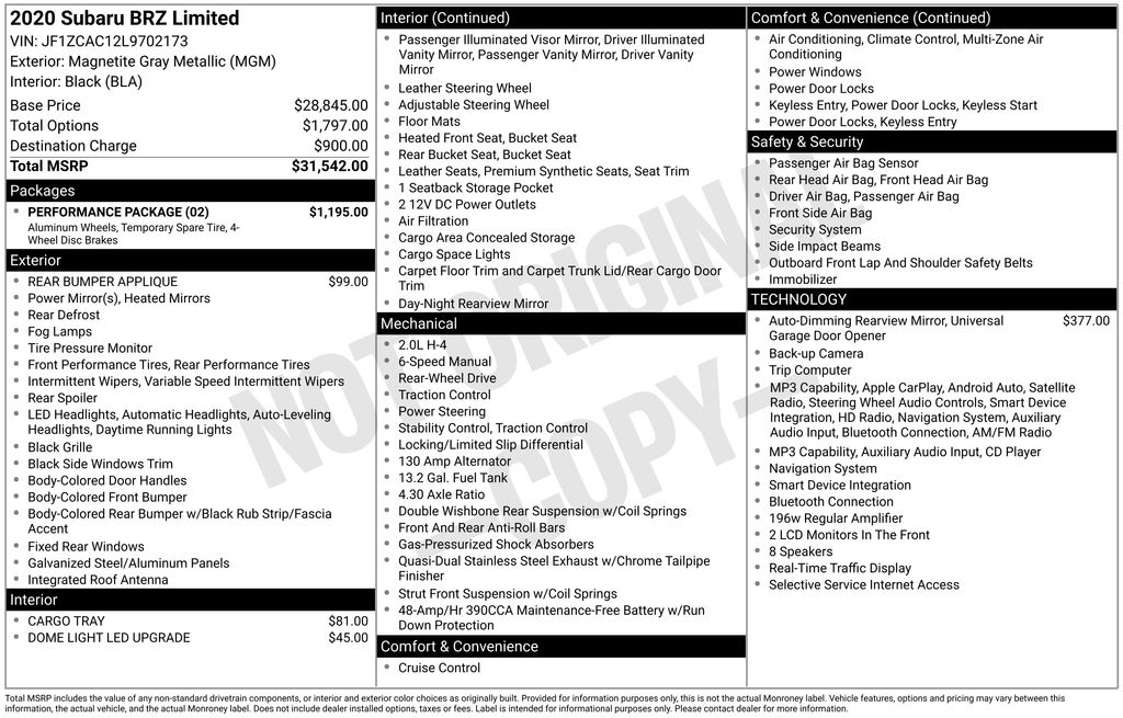 2020 Subaru BRZ Limited RWD Close-Ratio 6-Speed Manual 2.0L 4-Cylinder DOHC 16V Magnetite Gray Metallic