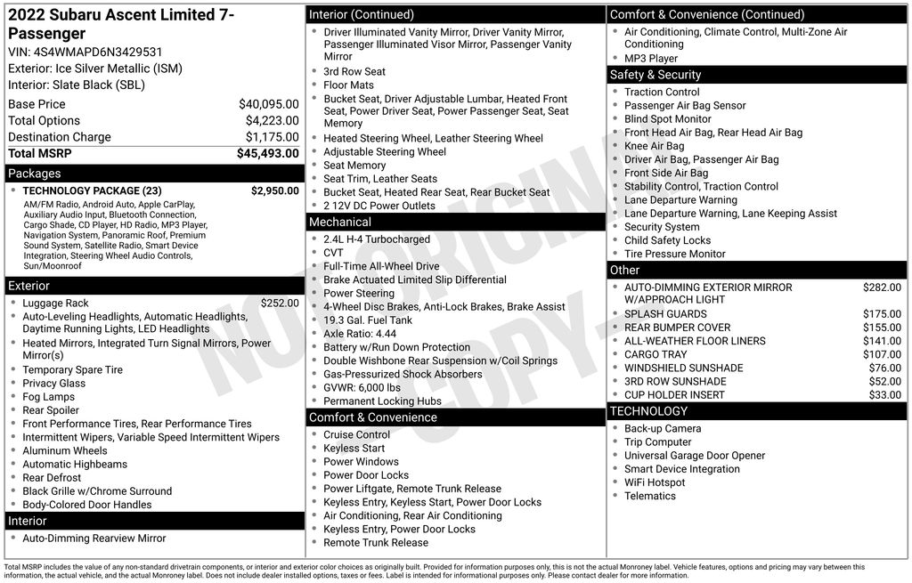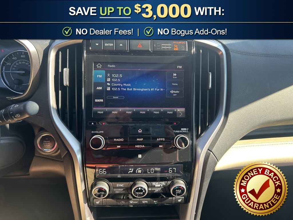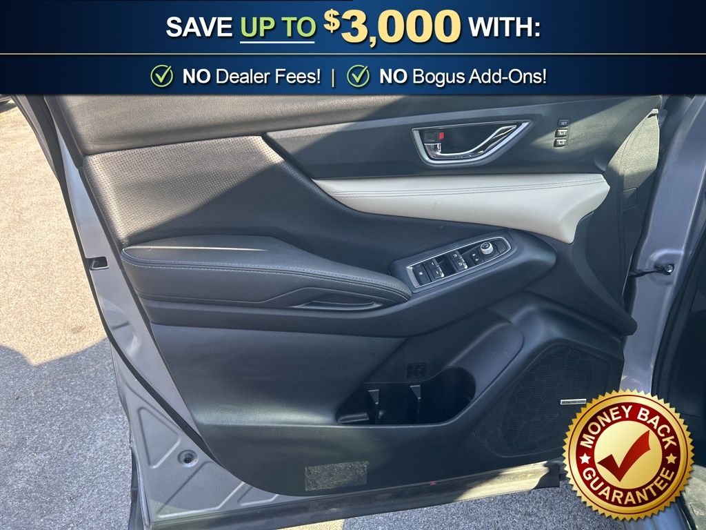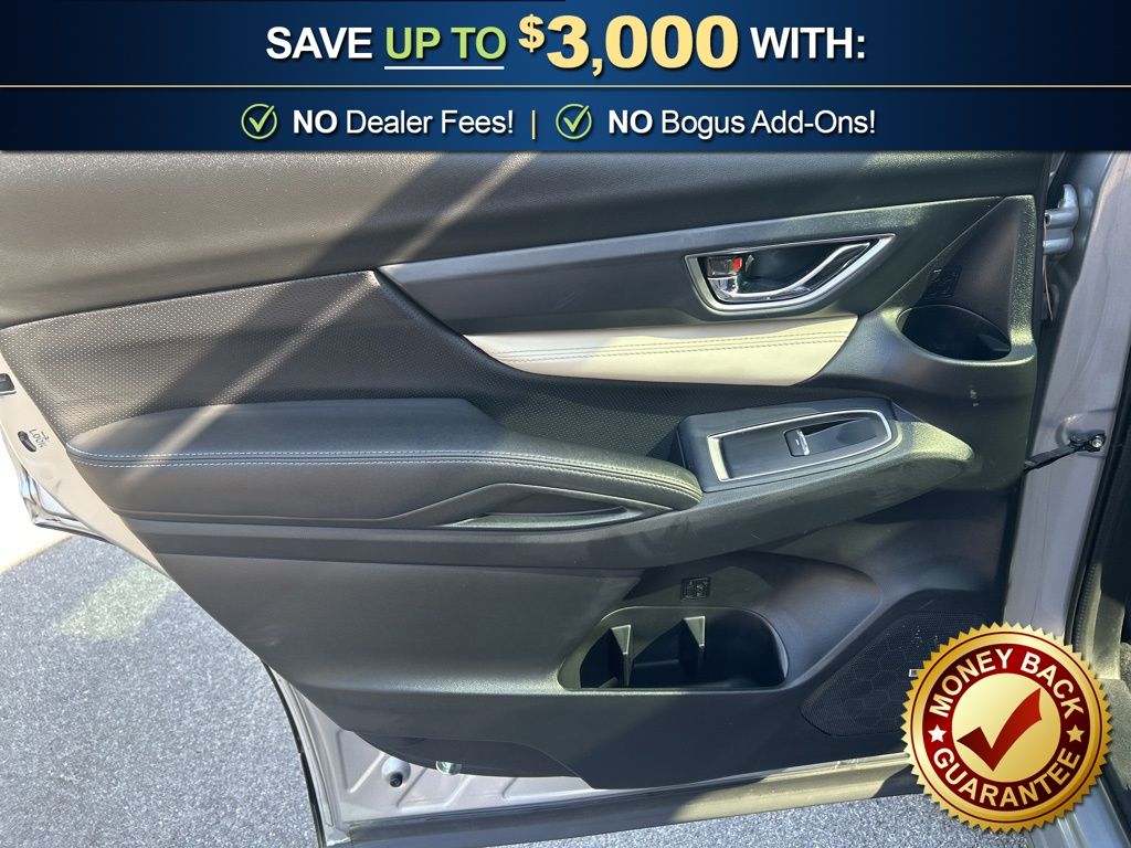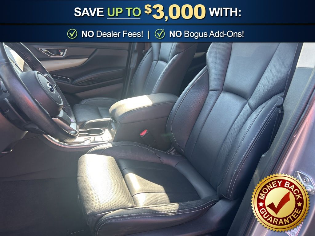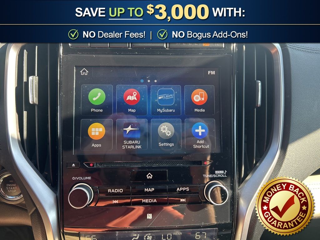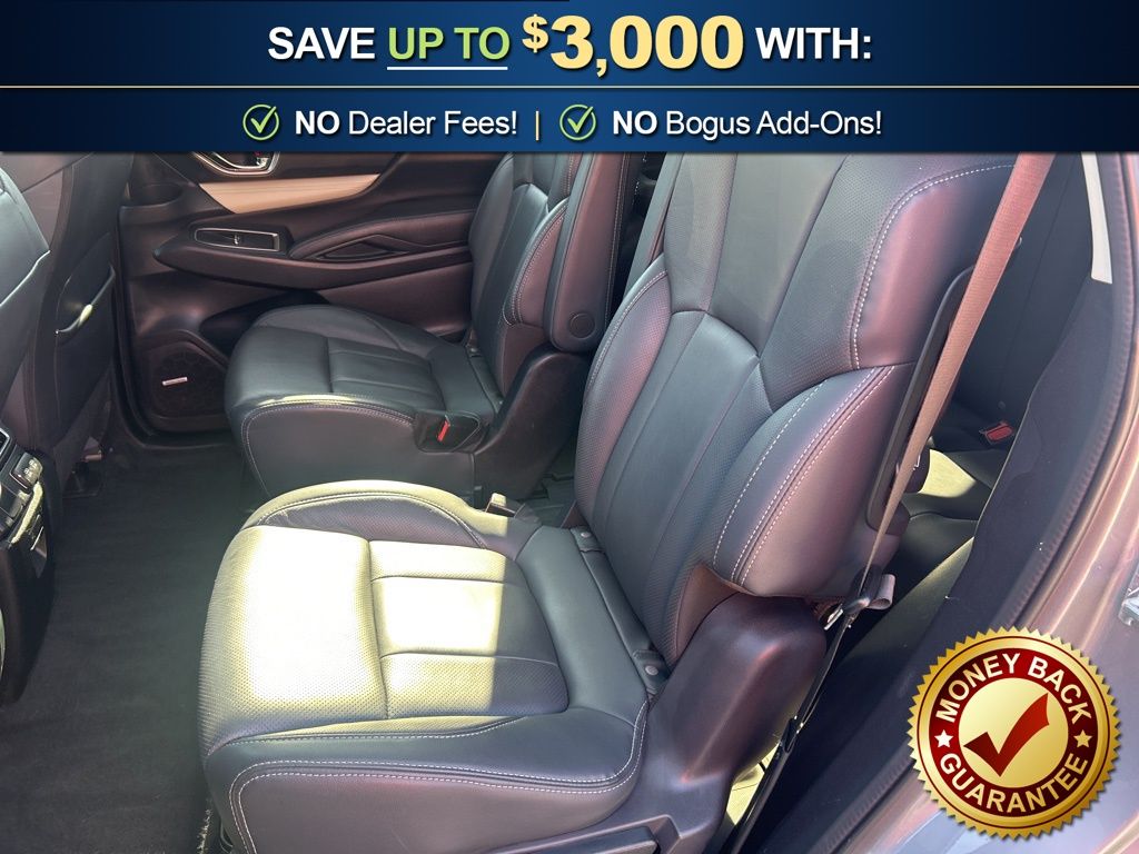 3rd row seats: bench, 3rd Row Sunshade, 4-Wheel Disc Brakes, 6 Speakers, ABS brakes, Aero Crossbar Set, Air Conditioning, All-Weather Floor Liners, Alloy wheels, AM/FM radio: SiriusXM, Auto High-beam Headlights, Auto-Dimming Exterior Mirror w/Approach Light, Auto-dimming Rear-View mirror, Automatic temperature control, Axle Ratio: 4.44, Brake assist, Bumpers: body-color, Cargo Area Cover, Cargo Tray, CD player, Compass, Cup Holder Insert, Delay-off headlights, Driver door bin, Driver vanity mirror, Dual front impact airbags, Dual front side impact airbags, Dual Glass Panoramic Power Moonroof, Electronic Stability Control, Emergency communication system: STARLINK Safety and Security (Subscription Required), Exterior Parking Camera Rear, Four wheel independent suspension, Front anti-roll bar, Front Bucket Seats, Front Center Armrest, Front dual zone A/C, Front fog lights, Front reading lights, Fully automatic headlights, Garage door transmitter: HomeLink, Heated door mirrors, Heated Front Bucket Seats, Heated front seats, Heated rear seats, Heated steering wheel, Illuminated entry, Knee airbag, Low tire pressure warning, Memory seat, Occupant sensing airbag, Outside temperature display, Overhead airbag, Overhead console, Panic alarm, Passenger door bin, Passenger vanity mirror, Perforated Leather-Trimmed Upholstery, Power door mirrors, Power driver seat, Power Liftgate, Power passenger seat, Power steering, Power windows, Radio data system, Radio: Subaru STARLINK 8.0" Multimedia Nav System, Radio: Subaru STARLINK 8.0" Multimedia Plus System, Rear air conditioning, Rear anti-roll bar, Rear Bumper Cover, Rear reading lights, Rear window defroster, Rear window wiper, Reclining 3rd row seat, Remote keyless entry, Security system, Speed control, Splash Guards, Split folding rear seat, Spoiler, STARLINK/Apple CarPlay/Android Auto, Steering wheel mounted audio controls, Tachometer, Technology Package, Telescoping steering wheel, Tilt steering wheel, Traction control, Trip computer, Turn signal indicator mirrors, Variably intermittent wipers, Wheels: 20" x 7.5 J Dk Gray Alloy w/Machine Finish, Windshield Sunshade.