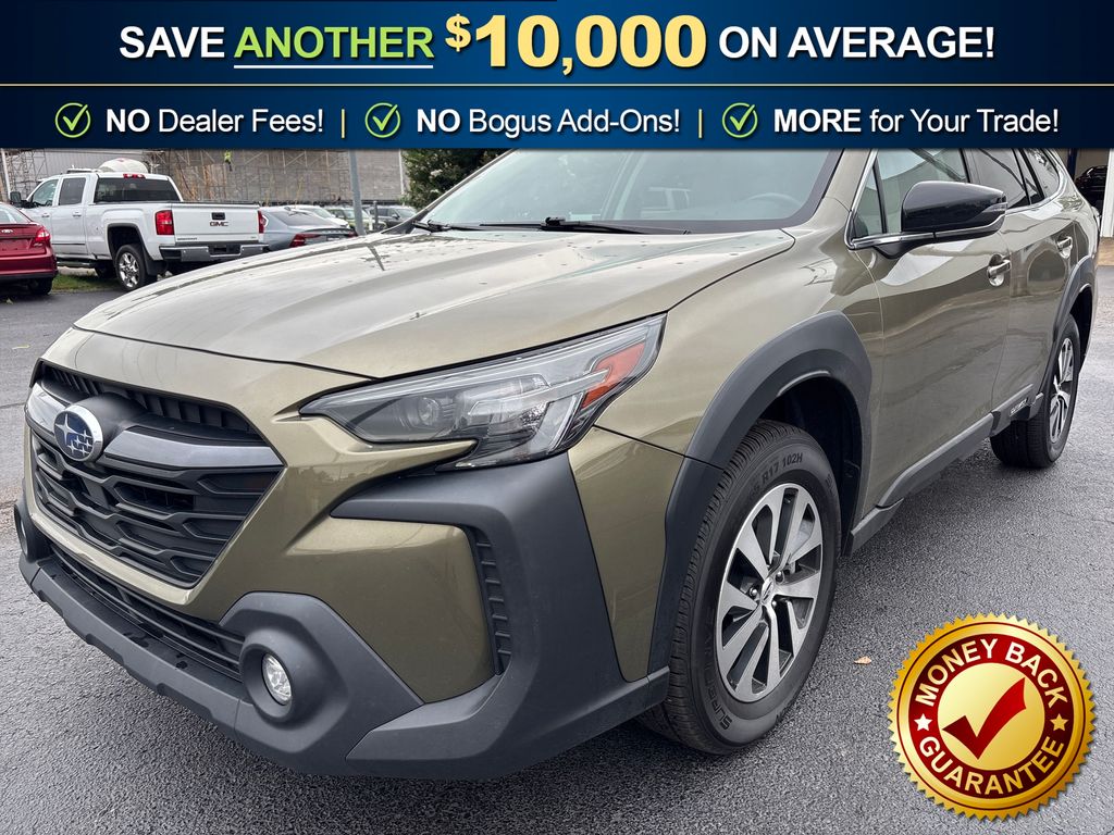 2023 Subaru Outback Premium Green Metallic Premium AWD CVT Lineartronic 2.5L 4-Cylinder DOHC 16V 3.90 Axle Ratio, 4-Wheel Disc Brakes, 6 Speakers, ABS brakes, Air Conditioning, Alloy wheels, AM/FM radio: SiriusXM, Auto High-beam Headlights, Automatic temperature control, Blind Spot Detection (BSD), Brake assist, BSD & RCTA & Keyless Access & Push Button Start, Bumpers: body-color, Cloth Upholstery, Driver door bin, Driver vanity mirror, Dual front impact airbags, Dual front side impact airbags, Electronic Stability Control, Emergency communication system: STARLINK Safety Plus (3-year free trial), Exterior Parking Camera Rear, Four wheel independent suspension, Front anti-roll bar, Front Bucket Seats, Front Center Armrest w/Storage, Front dual zone A/C, Front fog lights, Front reading lights, Fully automatic headlights, Hands-Free Power Rear Gate, Heated door mirrors, Heated Front Bucket Seats, Heated front seats, Illuminated entry, Keyless Access w/Push Button Start, Knee airbag, Leather Shift Knob, Leather steering wheel, Low tire pressure warning, Occupant sensing airbag, Outside temperature display, Overhead airbag, Overhead console, Panic alarm, Passenger door bin, Passenger vanity mirror, Power door mirrors, Power driver seat, Power Moonroof, Power steering, Power windows, Radio: Subaru STARLINK 11.6" Multimedia Nav System, Radio: Subaru STARLINK 11.6" Multimedia Plus Sys, Rear anti-roll bar, Rear Bumper Cover, Rear Cross Traffic Alert (RCTA), Rear seat center armrest, Rear window defroster, Rear window wiper, Remote keyless entry, Roof rack, Security system, Speed control, Speed-sensing steering, Split folding rear seat, Spoiler, Steering wheel mounted audio controls, Steering Wheel Paddle Shift Control Switches, Tachometer, Telescoping steering wheel, Tilt steering wheel, Traction control, Trip computer, Turn signal indicator mirrors, Variably intermittent wipers, Wheels: 17" x 7J Black Aluminum Alloy, Wireless Charger.
