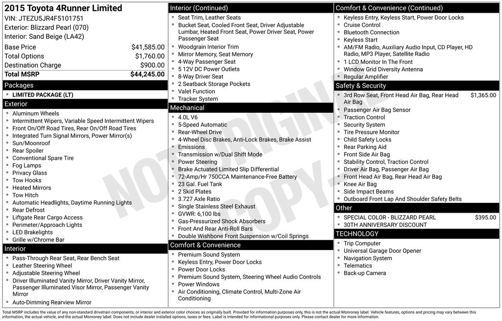 2015 Toyota 4Runner Limited RWD 5-Speed Automatic with Overdrive 4.0L V6 SMPI DOHC Blizzard Pearl