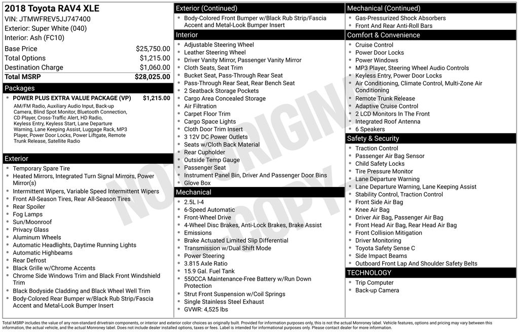 2018 Toyota RAV4 White FWD 6-Speed Automatic 2.5L 4-Cylinder DOHC Dual VVT-i Cloth, 3.815 Axle Ratio, 4-Wheel Disc Brakes, ABS brakes, Air Conditioning, Auto High-beam Headlights, Brake assist, Bumpers: body-color, Driver door bin, Driver vanity mirror, Dual front impact airbags, Dual front side impact airbags, Electronic Stability Control, Exterior Parking Camera Rear, Four wheel independent suspension, Front anti-roll bar, Front Bucket Seats, Front Center Armrest, Front reading lights, Fully automatic headlights, Illuminated entry, Knee airbag, Low tire pressure warning, Occupant sensing airbag, Outside temperature display, Overhead airbag, Overhead console, Panic alarm, Passenger door bin, Passenger vanity mirror, Power door mirrors, Power steering, Power windows, Radio data system, Rear anti-roll bar, Rear seat center armrest, Rear window defroster, Rear window wiper, Remote keyless entry, Speed control, Speed-sensing steering, Split folding rear seat, Spoiler, Steering wheel mounted audio controls, Tachometer, Telescoping steering wheel, Tilt steering wheel, Traction control, Trip computer, Cloth.