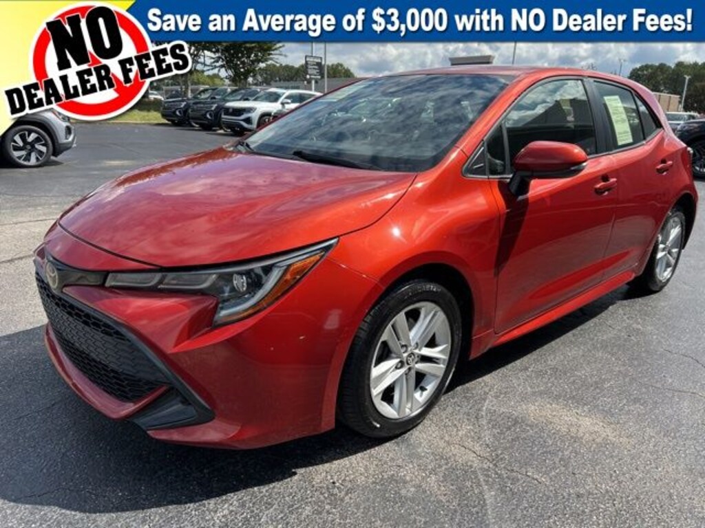 2019 Toyota Corolla Hatchback Red FWD 2.0L I4 4-Wheel Disc Brakes, 6 Speakers, ABS brakes, Air Conditioning, Alloy wheels, Auto High-beam Headlights, Automatic temperature control, Blind Spot Monitoring, Brake assist, Bumpers: body-color, Compass, Delay-off headlights, Driver door bin, Driver vanity mirror, Dual front impact airbags, Dual front side impact airbags, Electronic Stability Control, Emergency communication system: Safety Connect, Exterior Parking Camera Rear, Four wheel independent suspension, Front anti-roll bar, Front Bucket Seats, Front Center Armrest, Front reading lights, Heated door mirrors, Illuminated entry, Knee airbag, Leather Shift Knob, Low tire pressure warning, Occupant sensing airbag, Outside temperature display, Overhead airbag, Overhead console, Panic alarm, Passenger door bin, Passenger vanity mirror, Power door mirrors, Power steering, Power windows, Radio data system, Rear anti-roll bar, Rear seat center armrest, Rear window defroster, Rear window wiper, Remote keyless entry, Satellite Radio, Security system, Speed control, Speed-sensing steering, Split folding rear seat, Spoiler, Steering wheel mounted audio controls, Tachometer, Telescoping steering wheel, Tilt steering wheel, Traction control, Trip computer, Turn signal indicator mirrors, Variably intermittent wipers.