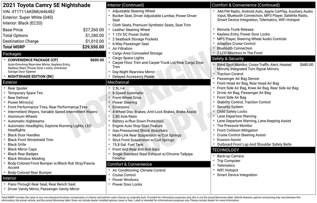 2021 Toyota Camry White FWD 8-Speed Automatic 2.5L I4 DOHC 16V Cloth, 4-Wheel Disc Brakes, 6 Speakers, ABS brakes, Air Conditioning, Alloy wheels, AM/FM radio: SiriusXM, Apple CarPlay/Android Auto, Auto High-beam Headlights, Automatic temperature control, Brake assist, Bumpers: body-color, Delay-off headlights, Driver door bin, Driver vanity mirror, Dual front impact airbags, Dual front side impact airbags, Electronic Stability Control, Emergency communication system: Safety Connect with 1-year trial, Exterior Parking Camera Rear, Fabric Seat Trim w/Sport SofTex, Four wheel independent suspension, Front anti-roll bar, Front Bucket Seats, Front Center Armrest, Front reading lights, Fully automatic headlights, Illuminated entry, Knee airbag, Low tire pressure warning, Occupant sensing airbag, Outside temperature display, Overhead airbag, Overhead console, Panic alarm, Passenger door bin, Passenger vanity mirror, Power door mirrors, Power driver seat, Power steering, Power windows, Radio data system, Radio: AM/FM Audio System, Rear anti-roll bar, Rear seat center armrest, Rear side impact airbag, Rear window defroster, Remote keyless entry, Security system, Speed control, Speed-sensing steering, Split folding rear seat, Spoiler, Steering wheel mounted audio controls, Tachometer, Telescoping steering wheel, Tilt steering wheel, Traction control, Trip computer, Variably intermittent wipers, Cloth.