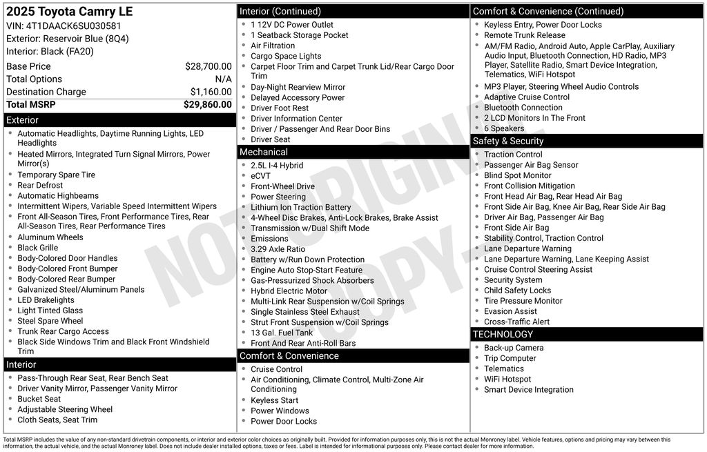 2025 Toyota Camry LE Blue LE FWD eCVT 2.5L 4-Cylinder 16V DOHC 2.5L 4-Cylinder 16V DOHC, ABS brakes, Active Cruise Control, Alloy wheels, Electronic Stability Control, Front dual zone A/C, Heated door mirrors, Illuminated entry, Low tire pressure warning, Remote keyless entry, Traction control.