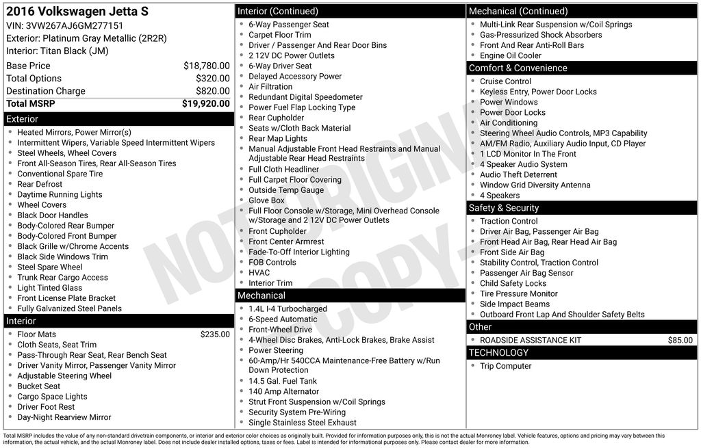 2016 Volkswagen Jetta 1.4T S Platinum Gray Metallic 1.4T S FWD 6-Speed Automatic with Tiptronic I4 Black Cloth, 15" Steel Wheels w/Full Covers, 4 Speaker Audio System, 4 Speakers, 4-Wheel Disc Brakes, ABS brakes, Air Conditioning, AM/FM radio, Brake assist, Bumpers: body-color, CD player, Cloth Seat Trim, Driver door bin, Driver vanity mirror, Dual front impact airbags, Dual front side impact airbags, Electronic Stability Control, Four wheel independent suspension, Front anti-roll bar, Front Bucket Seats, Front Center Armrest, Heated door mirrors, Heavy Duty Trunk Liner w/CarGo Blocks, Illuminated entry, Low tire pressure warning, Occupant sensing airbag, Outside temperature display, Overhead airbag, Overhead console, Panic alarm, Passenger door bin, Passenger vanity mirror, Power door mirrors, Power steering, Power windows, Radio data system, Radio: Composition Color w/5" Touchscreen, Rear anti-roll bar, Rear reading lights, Rear window defroster, Remote keyless entry, Roadside Assistance Kit, Rubber Mat Kit, Speed control, Speed-sensing steering, Split folding rear seat, Steering wheel mounted audio controls, Tachometer, Telescoping steering wheel, Tilt steering wheel, Traction control, Trip computer, Variably intermittent wipers, Black Cloth.