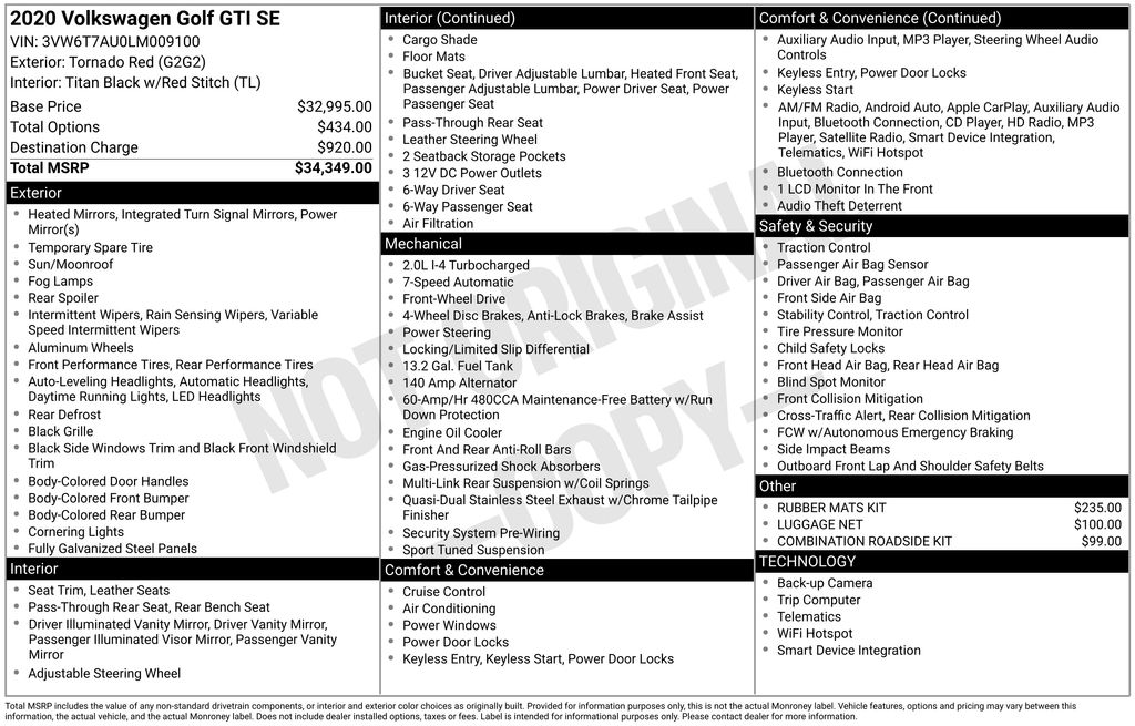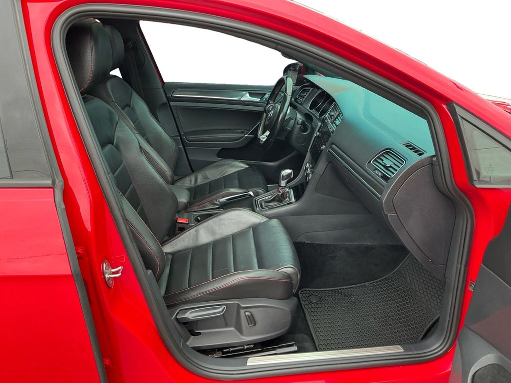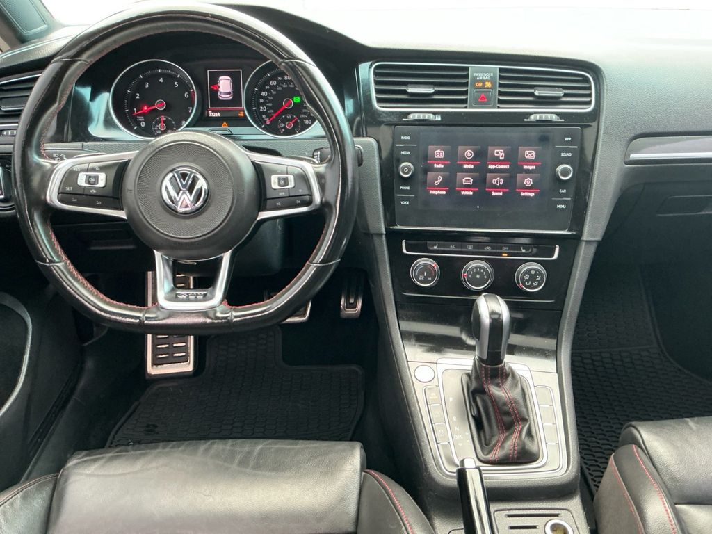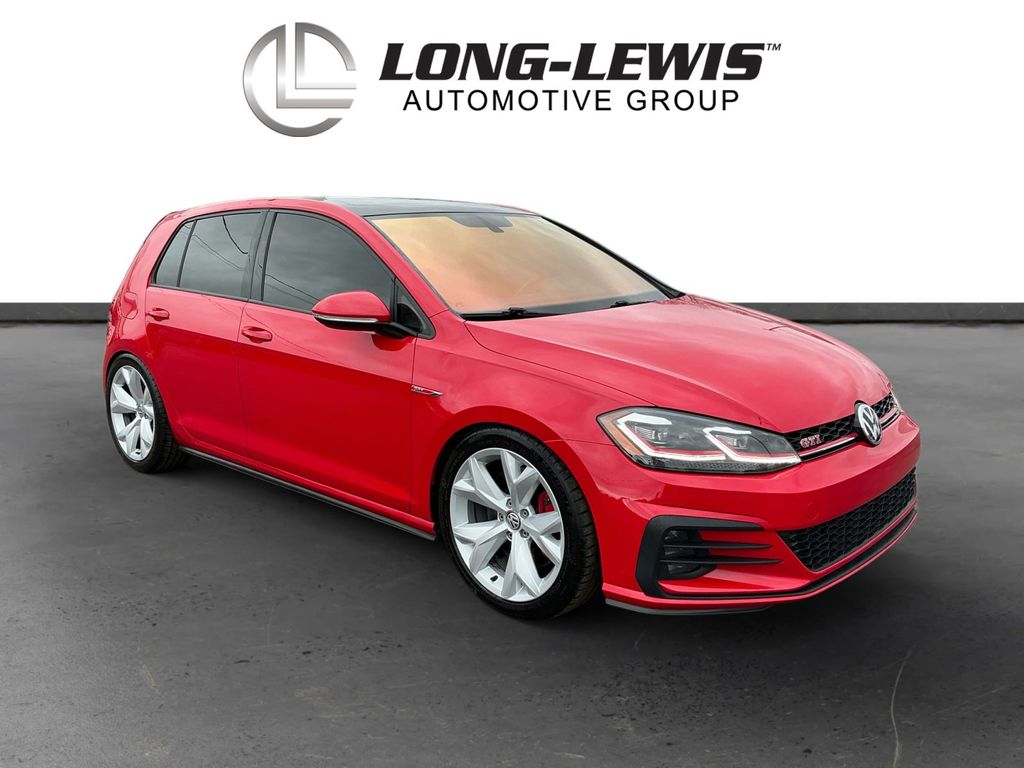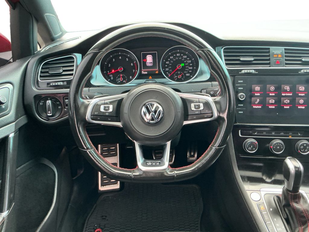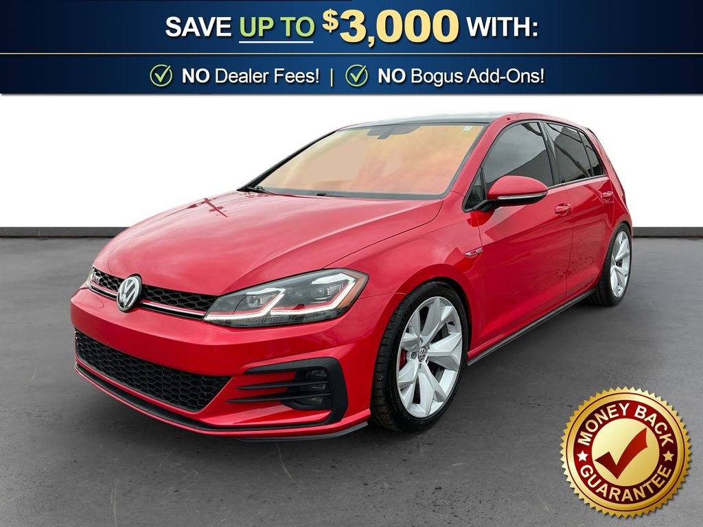 2020 Volkswagen Golf GTI 2.0T SE Tornado Red 2.0T SE FWD 7-Speed DSG Automatic with Tiptronic 2.0L TSI DOHC 4-Wheel Disc Brakes, 6 Speakers, ABS brakes, Active Blind Spot Monitor, Air Conditioning, Alloy wheels, AM/FM radio: SiriusXM, Anti-whiplash front head restraints, Brake assist, Bumpers: body-color, CD player, Compass, Delay-off headlights, Driver door bin, Driver vanity mirror, Dual front impact airbags, Dual front side impact airbags, Electronic Stability Control, Emergency communication system: VW Car-Net services (capabilities require enrollment or subscription), Exterior Parking Camera Rear, First Aid Kit, Forward collision: FCW w/Autonomous Emergency Braking mitigation, Four wheel independent suspension, Front anti-roll bar, Front Bucket Seats, Front Center Armrest, Front fog lights, Front reading lights, Fully automatic headlights, Heated door mirrors, Heated front seats, Heated Front Top Sport Seats, Illuminated entry, Leather Seating Surfaces, Leather Shift Knob, Low tire pressure warning, Luggage Net, Occupant sensing airbag, Outside temperature display, Overhead airbag, Overhead console, Panic alarm, Passenger door bin, Passenger vanity mirror, Power door mirrors, Power driver seat, Power moonroof, Power passenger seat, Power steering, Power windows, Radio data system, Radio: Composition Media w/8" Touchscreen, Radio: Discover Media w/8" Touchscreen Navigation, Rain sensing wipers, Rear anti-roll bar, Rear reading lights, Rear seat center armrest, Rear window defroster, Rear window wiper, Remote keyless entry, Roadside Assistance Kit, Rubber Mats Kit, Speed control, Speed-sensing steering, Speed-Sensitive Wipers, Split folding rear seat, Spoiler, Sport steering wheel, Steering wheel mounted audio controls, Tachometer, Telescoping steering wheel, Tilt steering wheel, Traction control, Trip computer, Turn signal indicator mirrors, Variably intermittent wipers, VW App-Connect (w/Apple CarPlay, Android Auto & MirrorLink), Wheels: 18" 5-Spoke 2-Tone Machined Alloy.