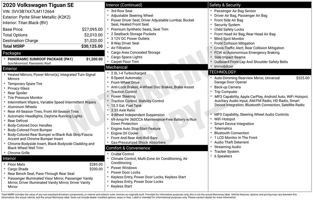 2020 Volkswagen Tiguan 2.0T SE Pyrite Silver Metallic 2.0T SE FWD 8-Speed Automatic with Tiptronic 2.0L TSI DOHC 3.33 Axle Ratio, 3rd row seats: bench, 4-Wheel Disc Brakes, 4-Wheel Independent Suspension, 6 Speakers, ABS brakes, Air Conditioning, Alloy wheels, AM/FM radio: SiriusXM, Automatic temperature control, Brake assist, Bumpers: body-color, Compass, Delay-off headlights, Driver door bin, Driver vanity mirror, Dual front impact airbags, Dual front side impact airbags, Electronic Stability Control, Emergency communication system: VW Car-Net services (capabilities require enrollment or subscription), Exterior Parking Camera Rear, Forward collision: FCW w/Autonomous Emergency Braking mitigation, Four wheel independent suspension, Front anti-roll bar, Front Bucket Seats, Front Center Armrest, Front dual zone A/C, Front reading lights, Fully automatic headlights, Heated door mirrors, Heated Front Comfort Seats, Heated front seats, Illuminated entry, Leather Shift Knob, Low tire pressure warning, Occupant sensing airbag, Outside temperature display, Overhead airbag, Overhead console, Panic alarm, Passenger door bin, Passenger vanity mirror, Perforated V-Tex Leatherette Seating Surfaces, Power door mirrors, Power driver seat, Power steering, Power windows, Radio data system, Radio: Composition Media AM/FM/HD, Rear anti-roll bar, Rear reading lights, Rear seat center armrest, Rear window defroster, Rear window wiper, Remote keyless entry, Roof rack: rails only, Security system, Speed control, Speed-sensing steering, Split folding rear seat, Spoiler, Steering wheel mounted audio controls, Tachometer, Telescoping steering wheel, Tilt steering wheel, Traction control, Trip computer, Turn signal indicator mirrors, Variably intermittent wipers, VW App-Connect (w/Apple CarPlay, Android Auto & MirrorLink), Wheels: 17" Multi-Spoke 2-Tone Alloy.