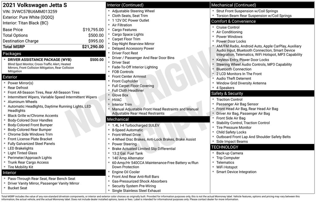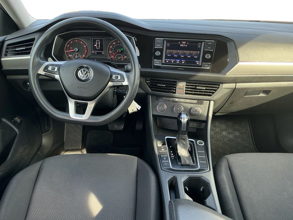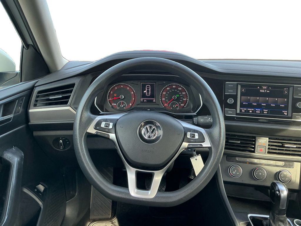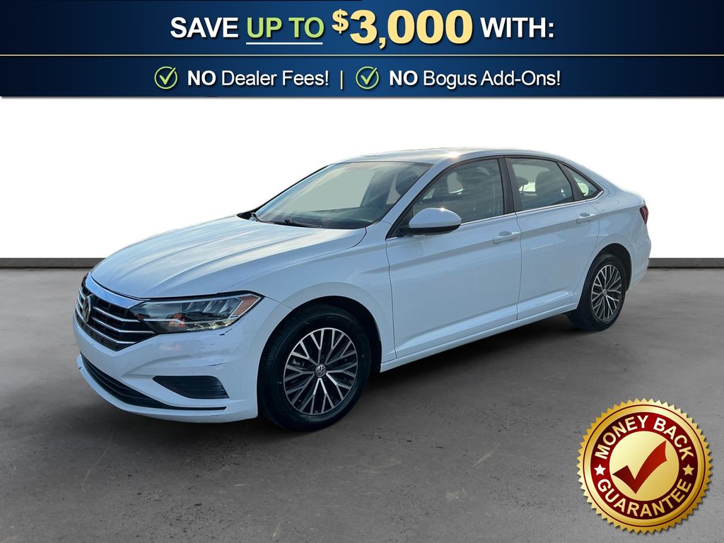 2021 Volkswagen Jetta 1.4T S Pure White 1.4T S FWD 8-Speed Automatic 1.4L TSI Black Cloth, 4 Speakers, 4-Wheel Disc Brakes, ABS brakes, Air Conditioning, Alloy wheels, AM/FM radio, Blind Spot Monitor, Brake assist, Bumpers: body-color, Cloth Seat Trim, Delay-off headlights, Driver Assistance Package, Driver door bin, Driver vanity mirror, Dual front impact airbags, Dual front side impact airbags, Electronic Stability Control, Emergency communication system: VW Car-Net services (capabilities require enrollment or subscription), Exterior Parking Camera Rear, Front anti-roll bar, Front Assist w/Autonomous Emergency Braking, Front Bucket Seats, Front Center Armrest, Front Comfort Seats, Front wheel independent suspension, Fully automatic headlights, Heated Side Mirrors, Illuminated entry, Low tire pressure warning, Occupant sensing airbag, Outside temperature display, Overhead airbag, Overhead console, Panic alarm, Passenger door bin, Passenger vanity mirror, Power door mirrors, Power steering, Power windows, Radio data system, Radio: Composition Color w/6.5" Touchscreen, Rear anti-roll bar, Rear reading lights, Rear Traffic Alert, Rear window defroster, Remote keyless entry, Speed control, Speed-sensing steering, Split folding rear seat, Steering wheel mounted audio controls, Tachometer, Telescoping steering wheel, Tilt steering wheel, Traction control, Trip computer, Variably intermittent wipers, Wheels: 16" 2-Tone Machined Alloy, Black Cloth.