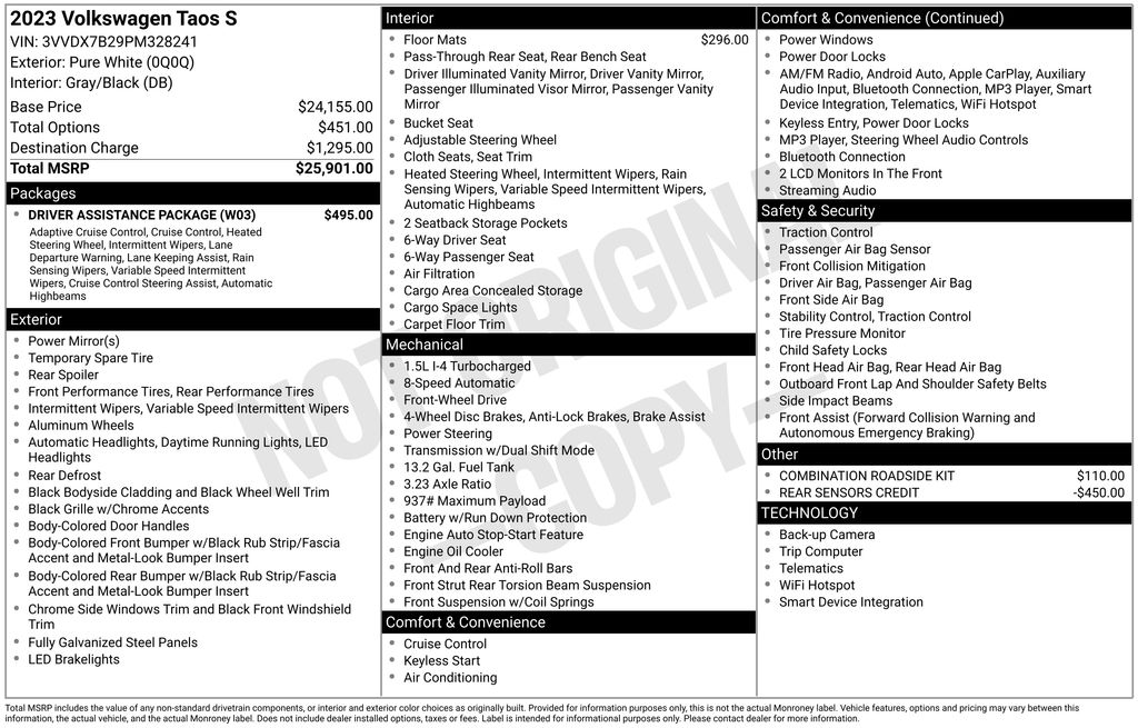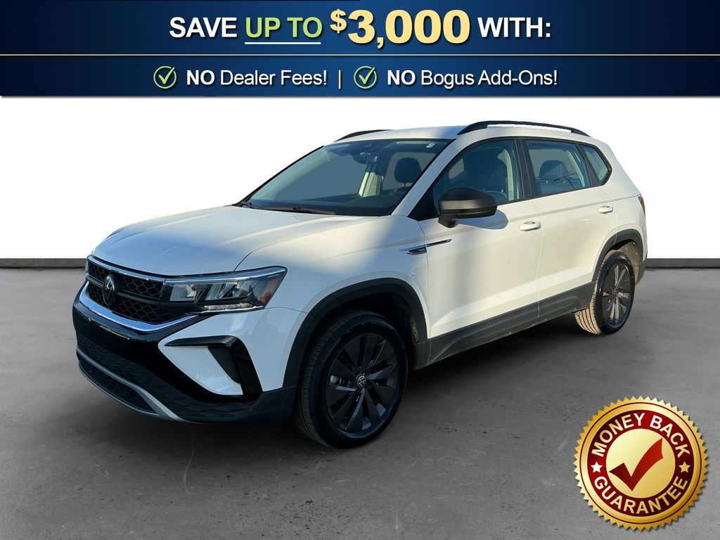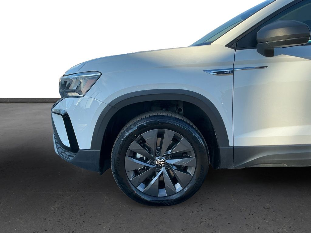 2023 Volkswagen Taos 1.5T S Pure White 1.5T S FWD 8-Speed Automatic with Tiptronic 1.5L I4 Turbocharged DOHC 16V LEV3-SULEV30 158hp 3.23 Axle Ratio, 4-Wheel Disc Brakes, 6 Speakers, ABS brakes, Adaptive Cruise Control (ACC) w/Stop & Go, Air Conditioning, Alloy wheels, AM/FM radio, Automatic Rain-Sensing Front Wipers, Brake assist, Bumpers: body-color, Cloth Seating Surfaces, Compass, Convenience Features, Delay-off headlights, Driver Assistance Package, Driver door bin, Driver vanity mirror, Dual front impact airbags, Dual front side impact airbags, Electronic Stability Control, Emergency Assist, Emergency communication system: VW Car-Net Safe & Secure 5-year, Exterior Parking Camera Rear, First Aid Kit, Front anti-roll bar, Front Bucket Seats, Front Center Armrest, Front reading lights, Front Strut Rear Torsion Beam Suspension, Front wheel independent suspension, Fully automatic headlights, Heated Leatherette-Wrapped Steering Wheel, Illuminated entry, Lane Assist (Lane Keeping System), Light Assist (High Beam Control For Headlights), Low tire pressure warning, Occupant sensing airbag, Outside temperature display, Overhead airbag, Overhead console, Panic alarm, Passenger door bin, Passenger vanity mirror, Power door mirrors, Power steering, Power windows, Radio data system, Radio: Composition Color AM/FM, Rear anti-roll bar, Rear seat center armrest, Rear Sensors Credit, Rear window defroster, Rear window wiper, Remote keyless entry, Roadside Assistance Kit, Roof rack: rails only, Rubber Mats Kit (SNM), Speed control, Speed-sensing steering, Split folding rear seat, Spoiler, Steering wheel mounted audio controls, Tachometer, Telescoping steering wheel, Tilt steering wheel, Traction control, Travel Assist (Semi-Automated Driving Assistance), Trip computer, Variably intermittent wipers, Wheels: 17" Silver Painted Alloy.